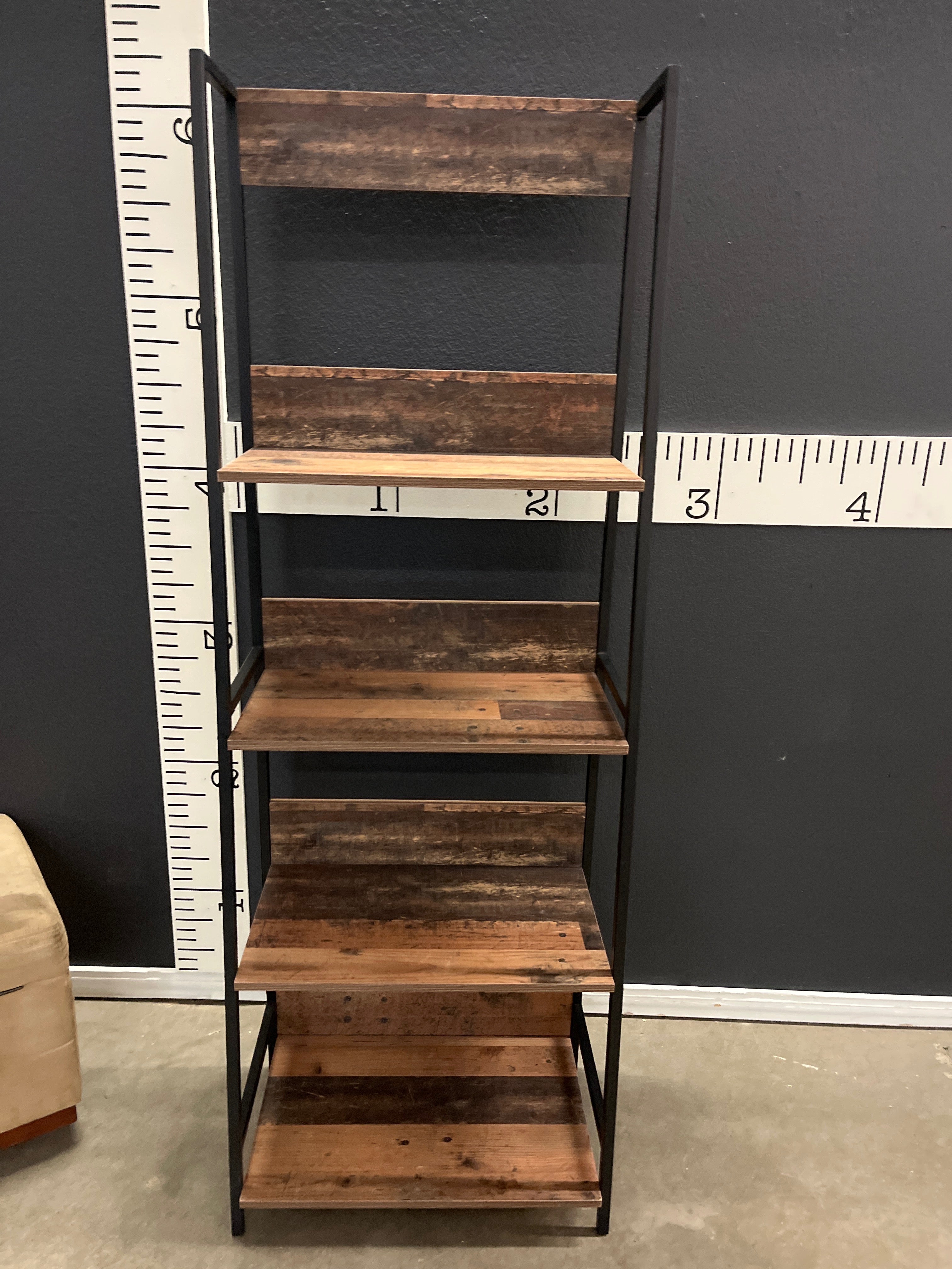 This industrial-style multi-tier shelf features a dark brown wood finish with a sturdy black metal frame. The rustic charm and open shelving design make it a versatile addition to any room. Approximate Size: 6 x 2 x 1