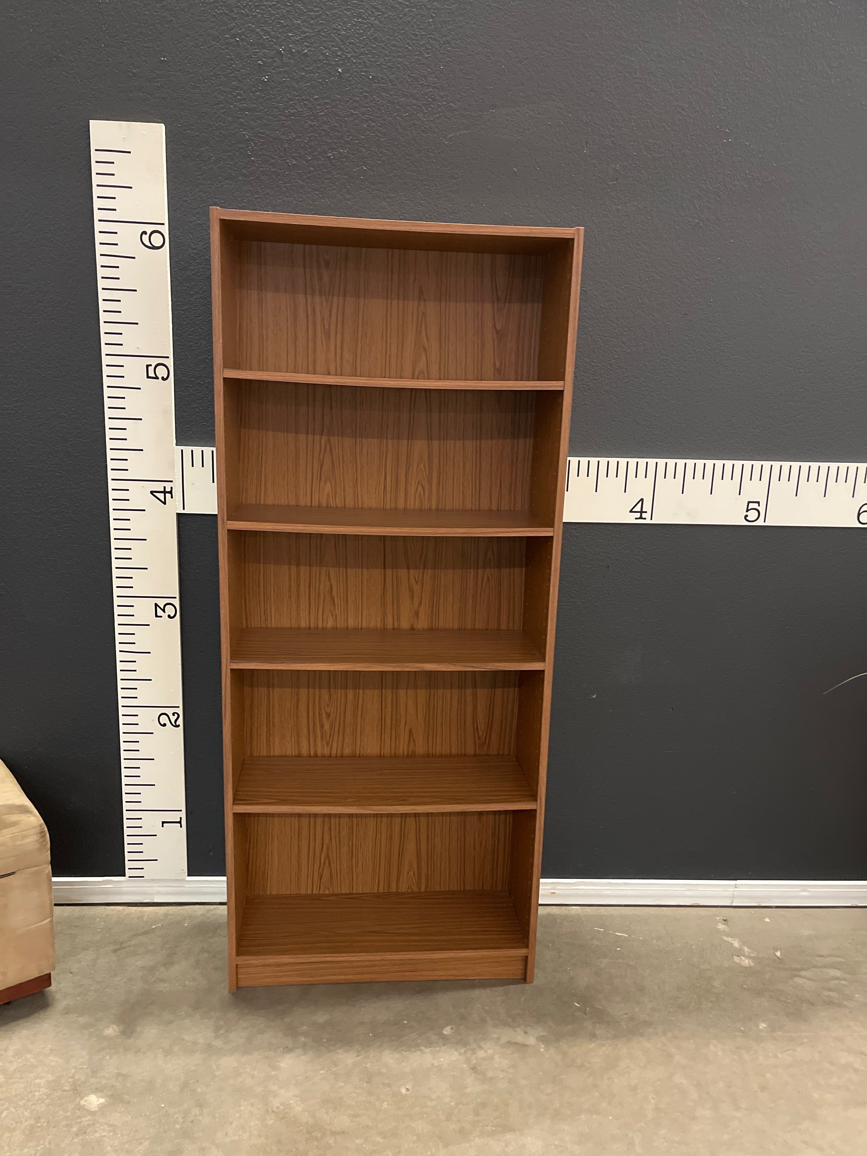 This tall wooden bookshelf features a warm brown finish with a smooth veneer surface. It offers ample storage with multiple shelves, perfect for organizing books and decorative items. Approximate Size: 6 x 2 x 1