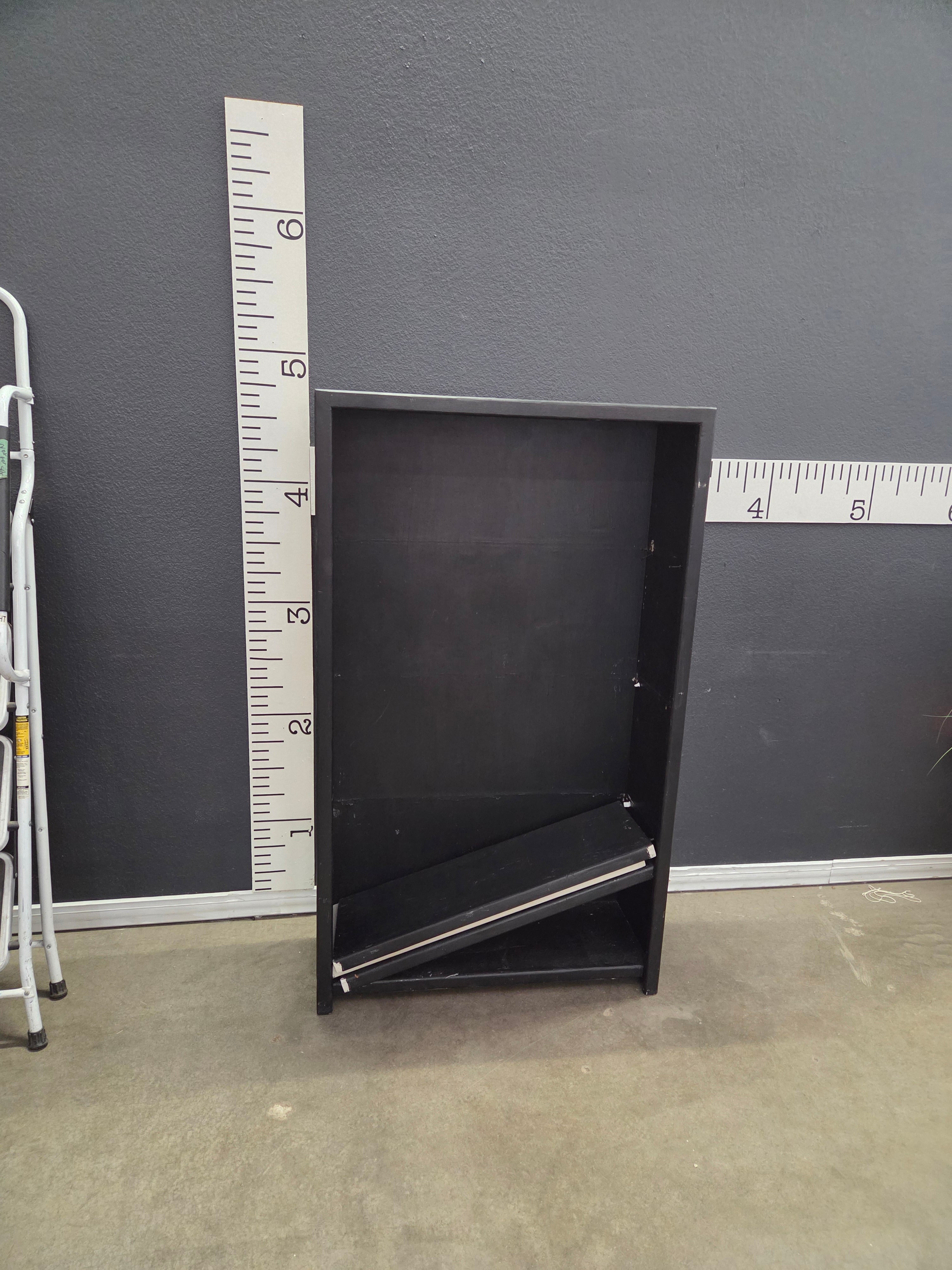This sleek black shoe rack cabinet features a smooth matte finish. It provides ample storage space with its smart, space-saving design, perfect for keeping your entryway organized. Approximate Size: 3 x 1.5 x 0.5
