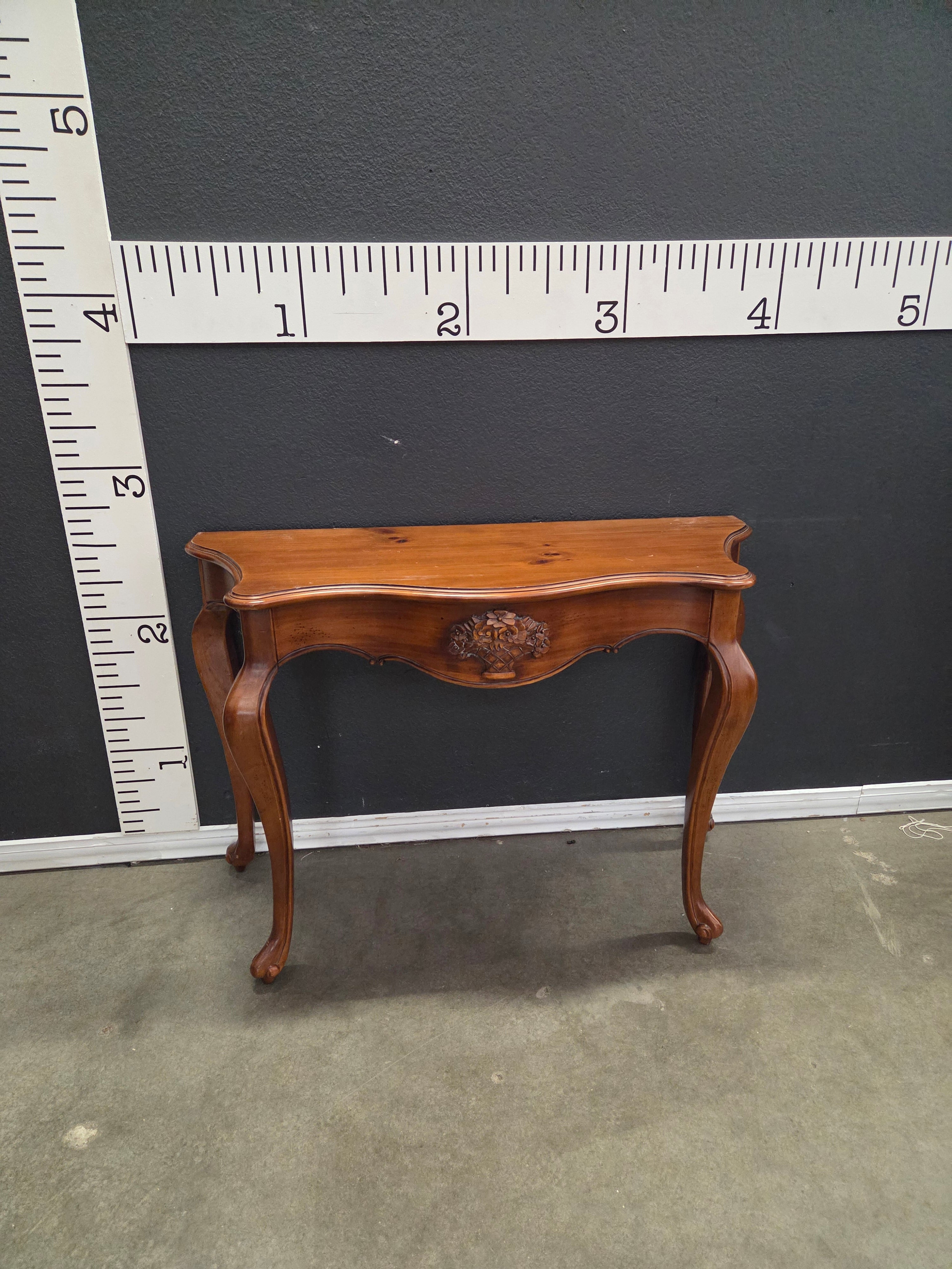 This elegant console table features a rich brown wooden finish with intricate carved detailing on the front. The classic design embodies a timeless appeal perfect for various home decor styles. Approximate Size: 3 x 3 x 1