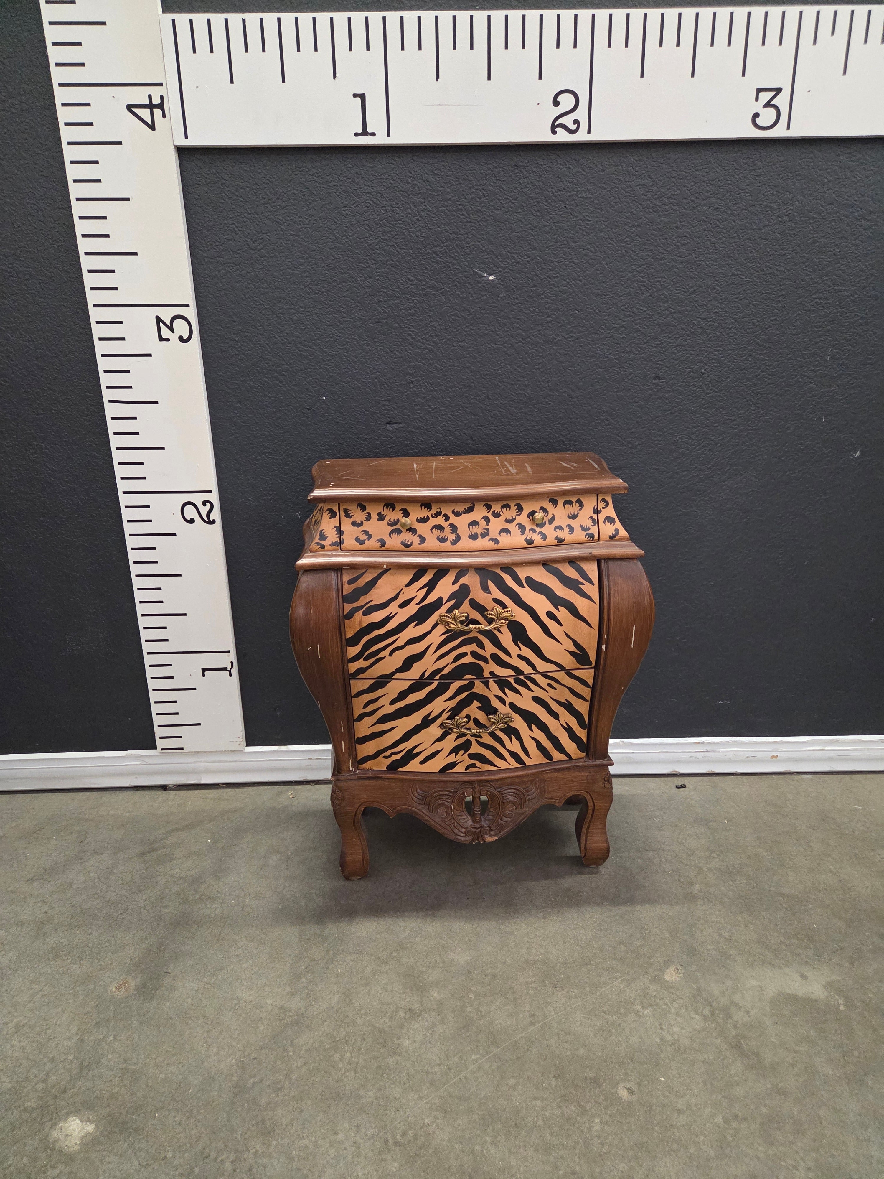 This unique cabinet features an eye-catching tiger stripe pattern with a rich brown finish. Crafted with quality wood, it sports a classic design with ornate detailing. Perfect for adding a wild touch to any room. Approximate Size: 2.5 x 1.5 x 1