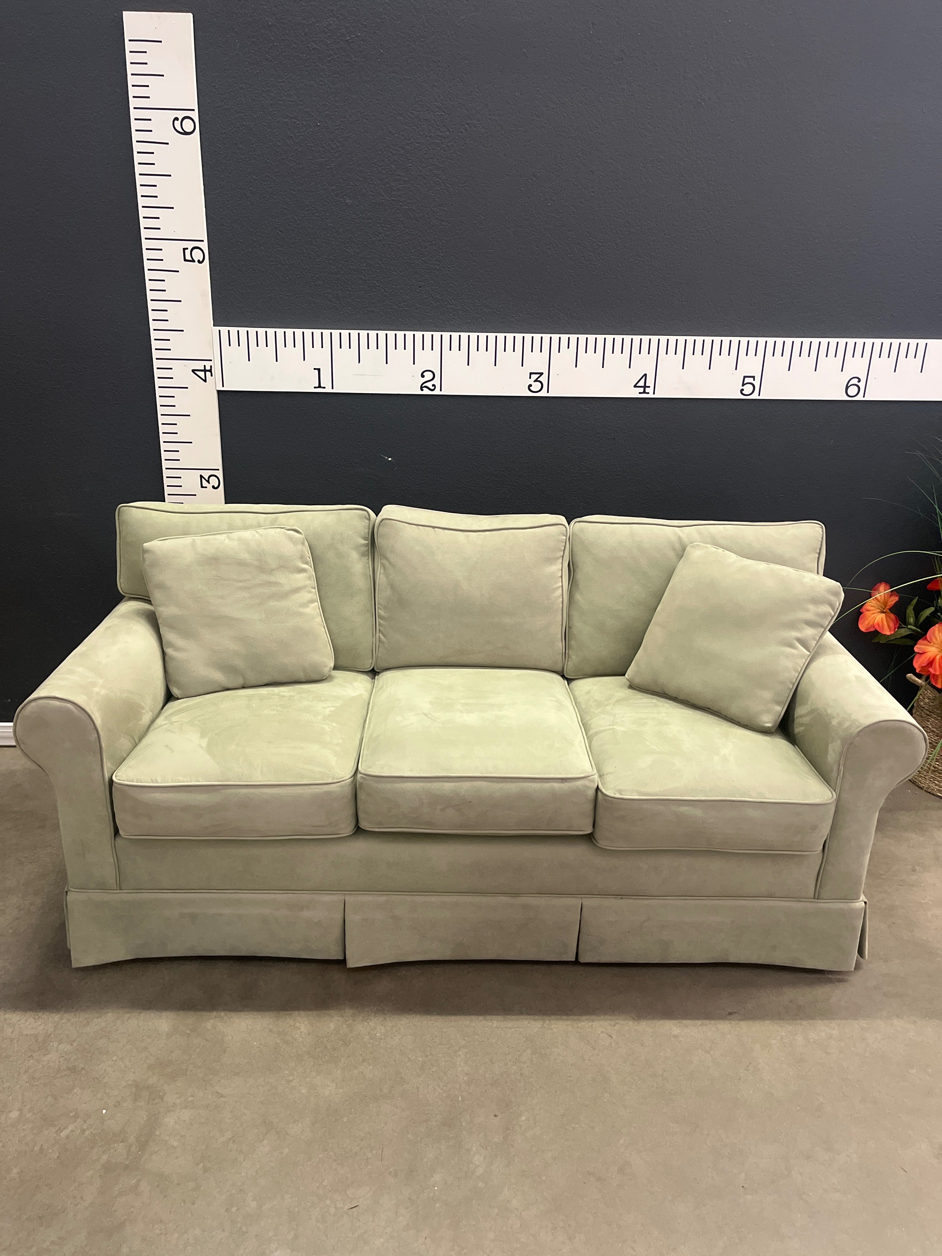 This elegant sofa features a soft sage green fabric with a smooth, plush finish. Its classic design and comfortable cushioning make it an ideal addition to any living room. Approximate Size: 3 x 6 x 2.5
