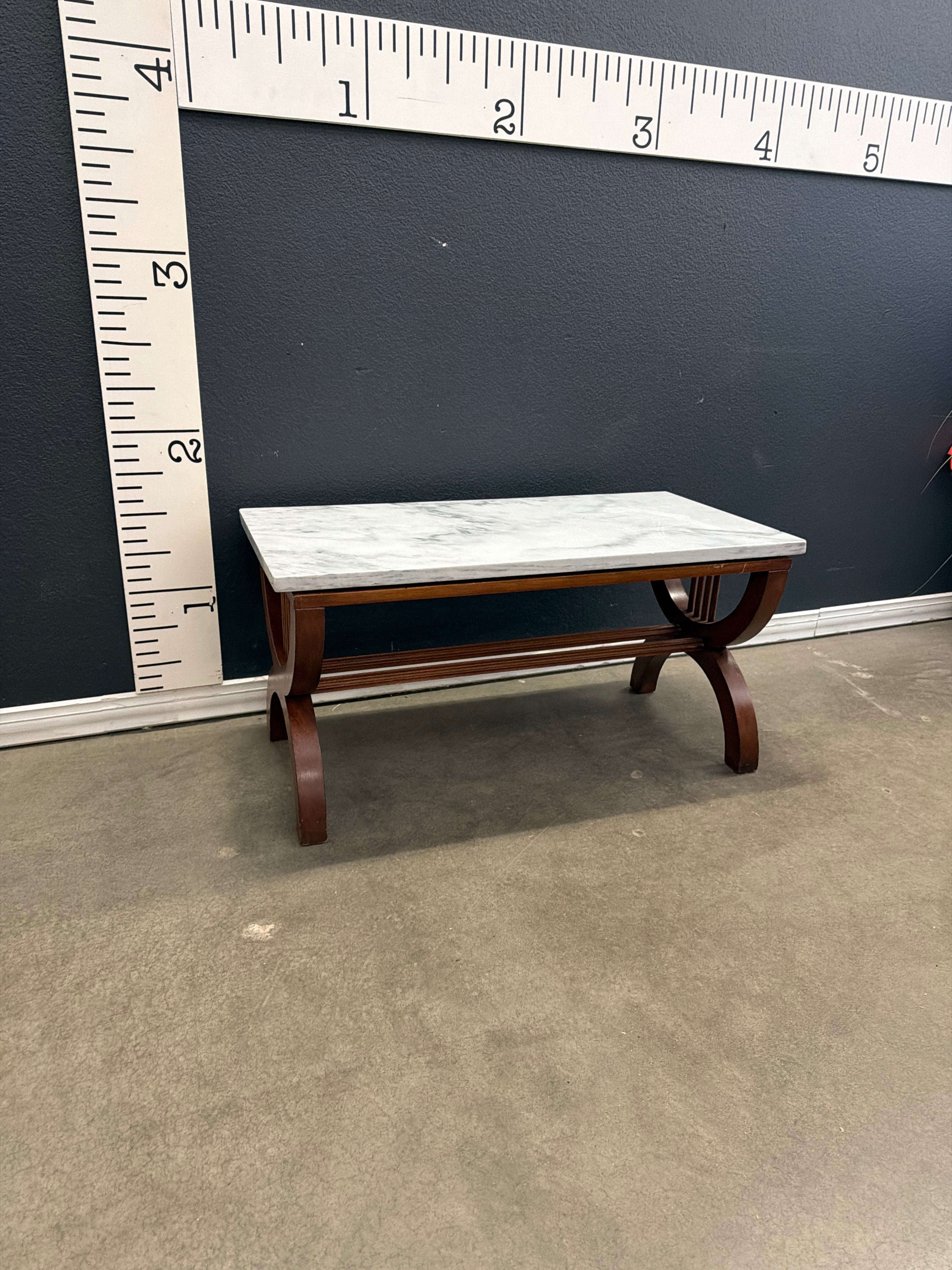 This elegant coffee table features a polished white marble top with natural veining, paired with a mahogany wood base in a rich, dark finish. The combination of materials offers a classic and sophisticated addition to any living space. Approximate Size: 1.5 x 4 x 2