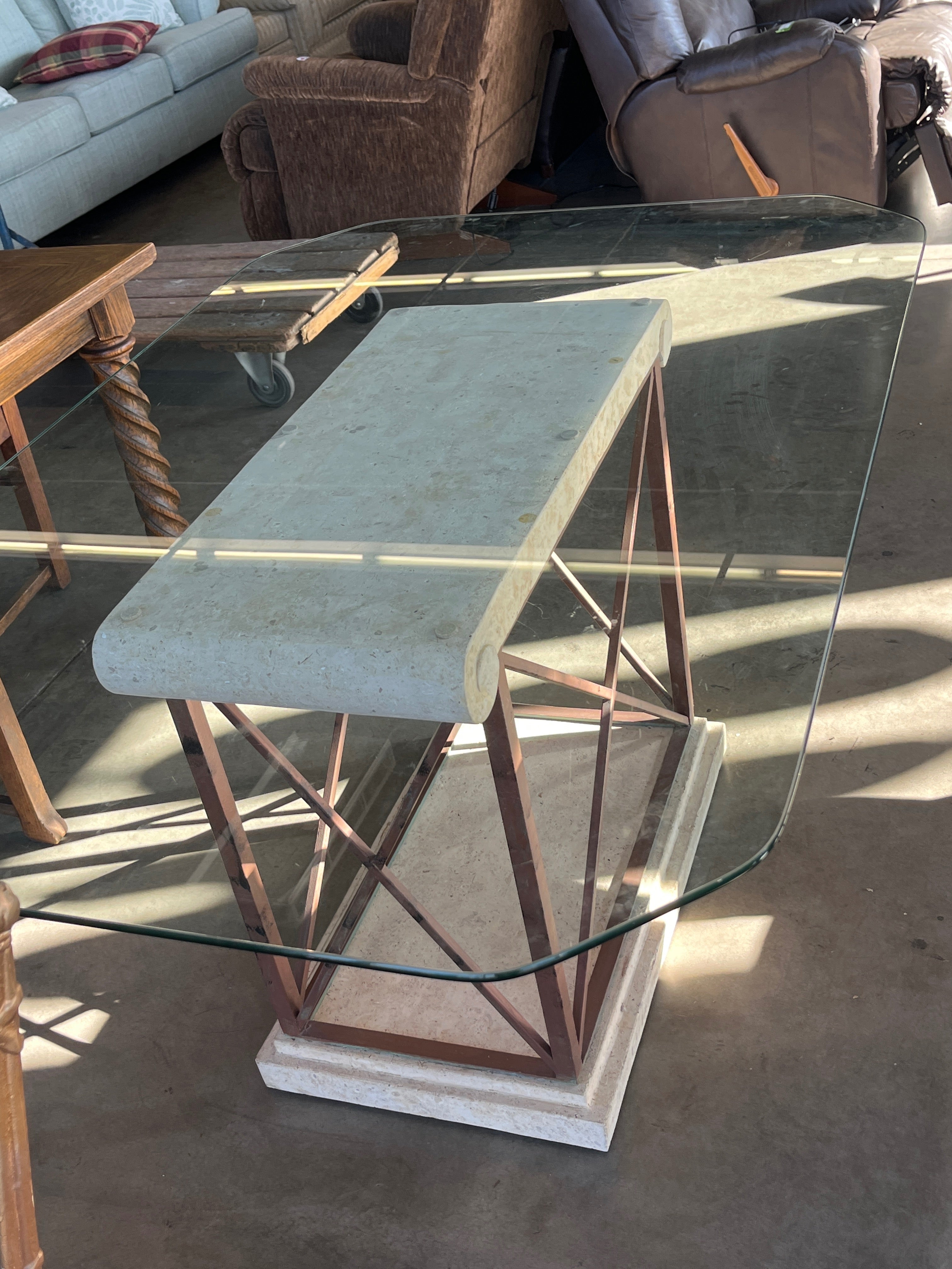 This contemporary coffee table features a sleek glass top with a sturdy stone and metal base. The base combines natural beige stone with a copper-finish metal framework, creating a stylish and durable centerpiece for your living room. Approximate Size: 1.5 x 4 x 2