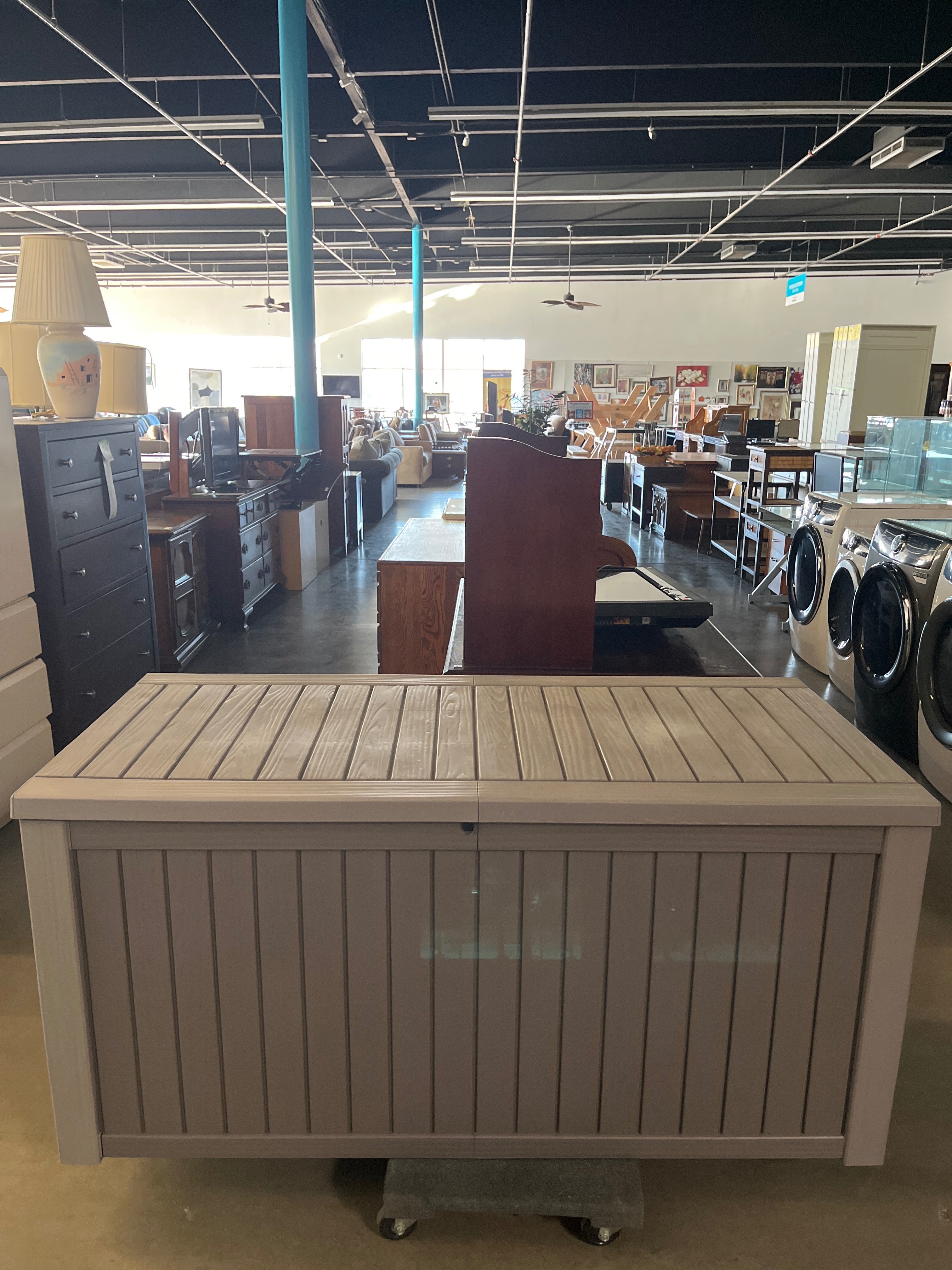 This spacious taupe deck box is perfect for patio and outdoor storage needs. It features a sturdy resin construction with a wood-like finish, offering a sleek and durable design. Approximate Size: 2 x 4 x 2