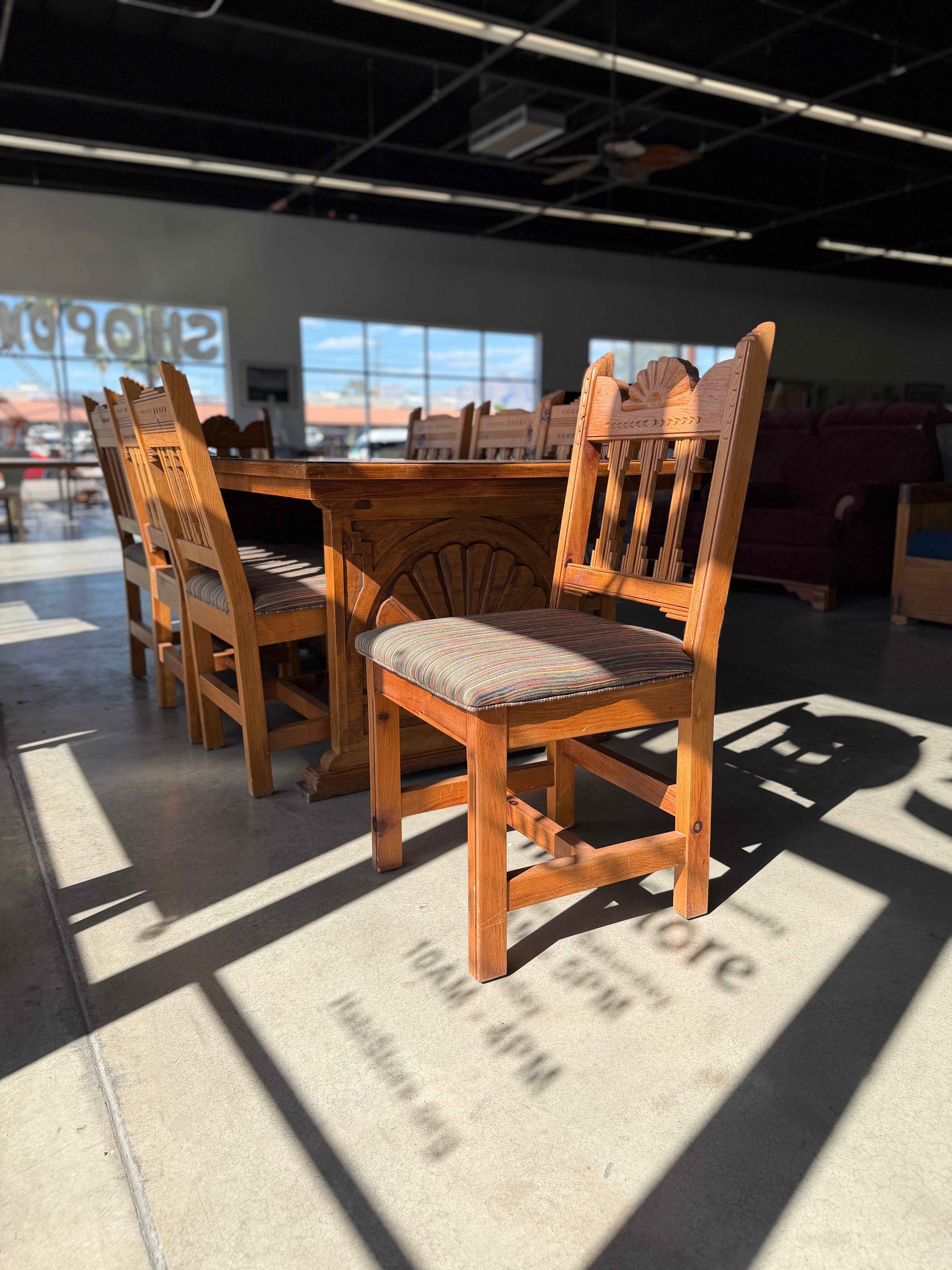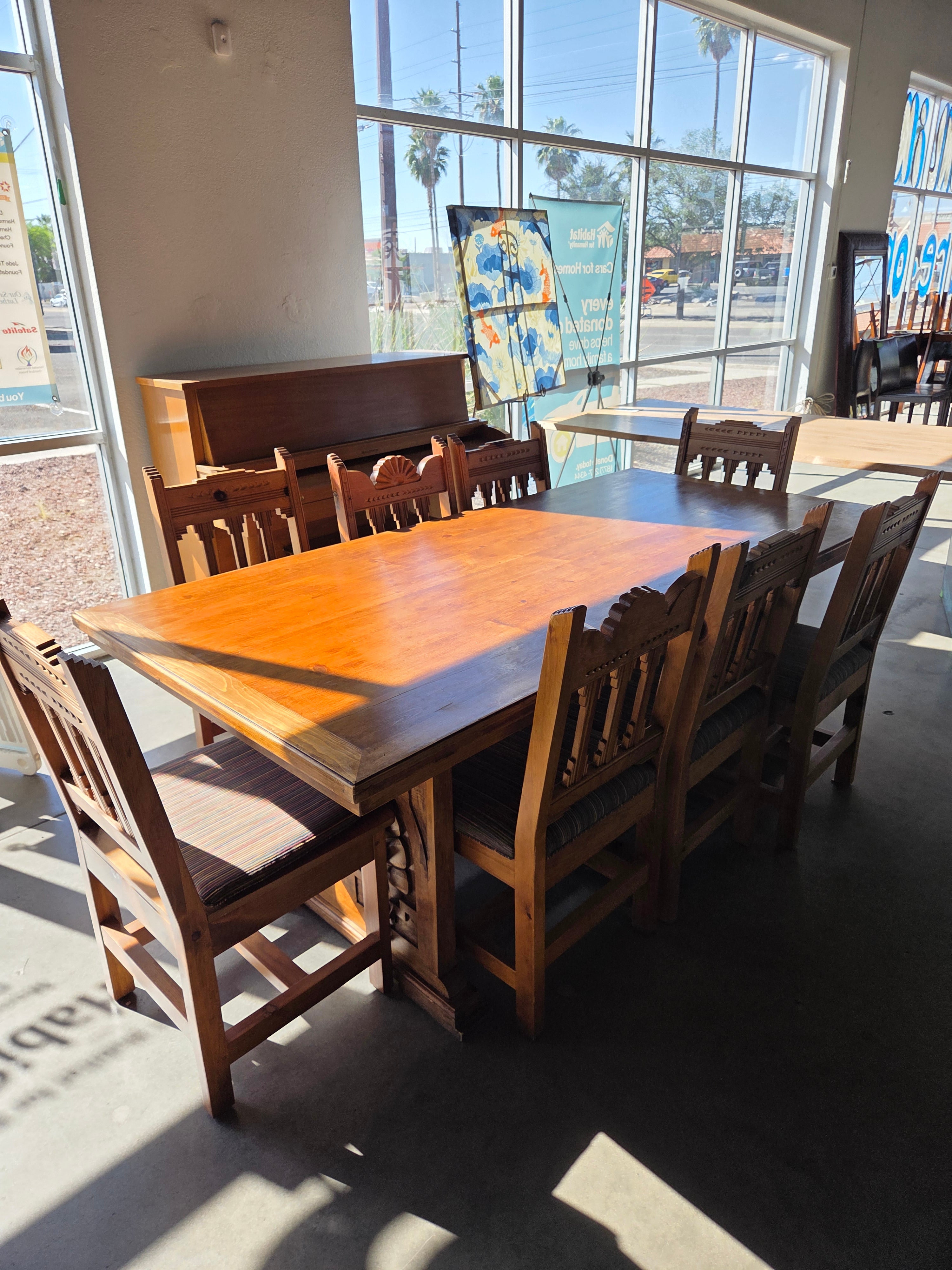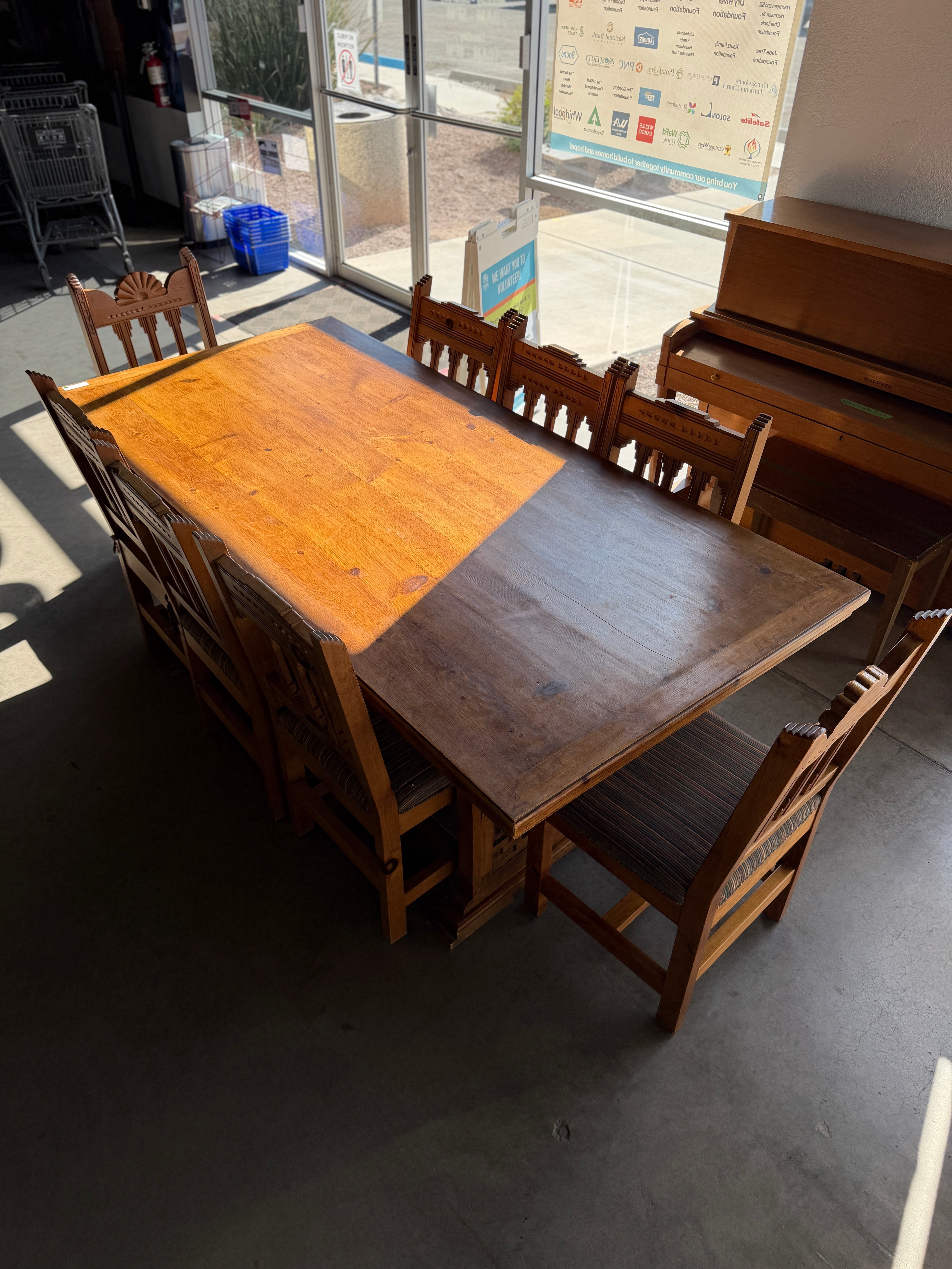This charming dining set features a solid wood table with a warm brown finish, complemented by eight matching chairs with upholstered seats. The elegant craftsmanship and classic design make it a perfect fit for any dining room. Approximate Size: 3 x 7 x 3