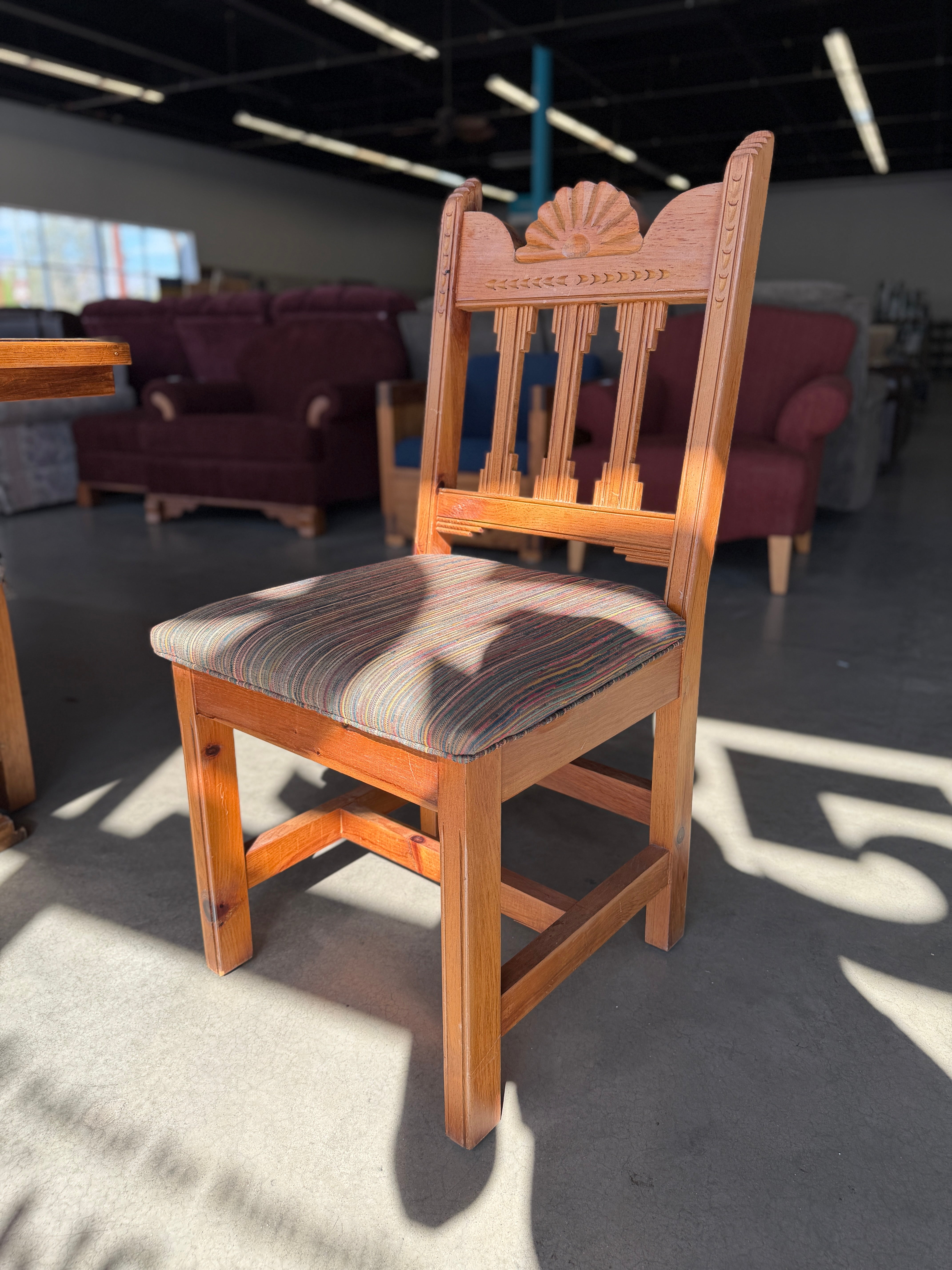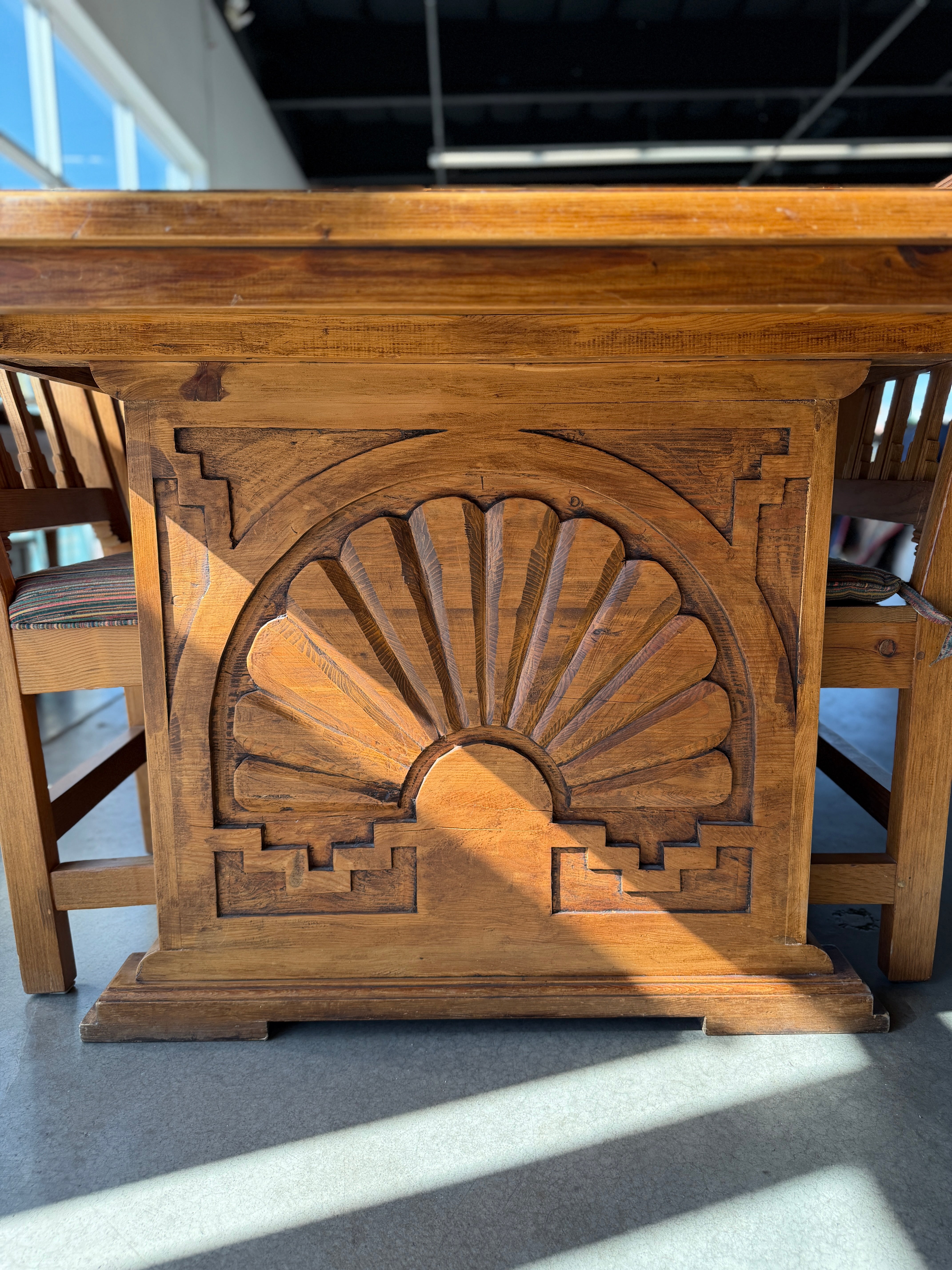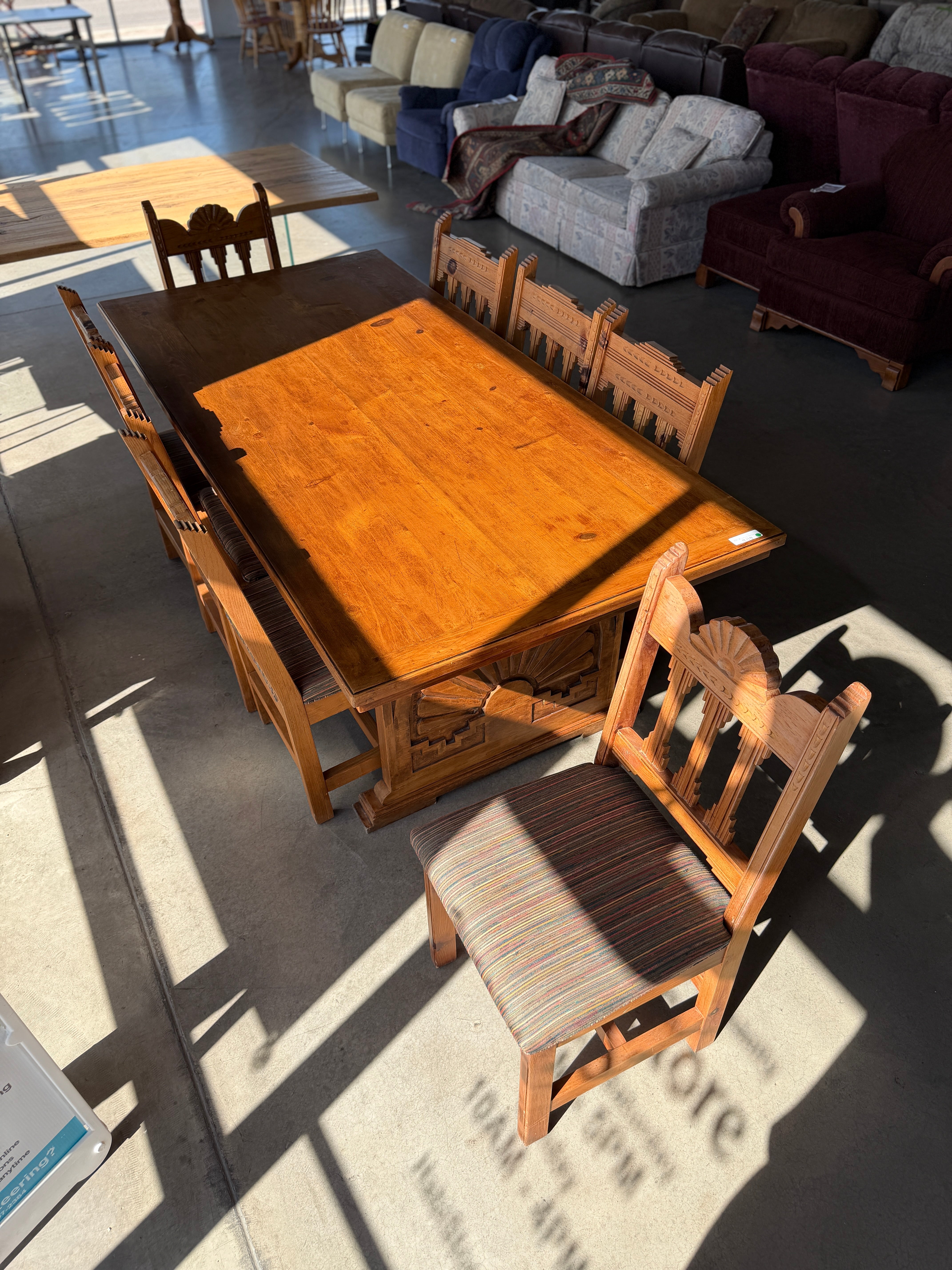 This charming dining set features a solid wood table with a warm brown finish, complemented by eight matching chairs with upholstered seats. The elegant craftsmanship and classic design make it a perfect fit for any dining room. Approximate Size: 3 x 7 x 3