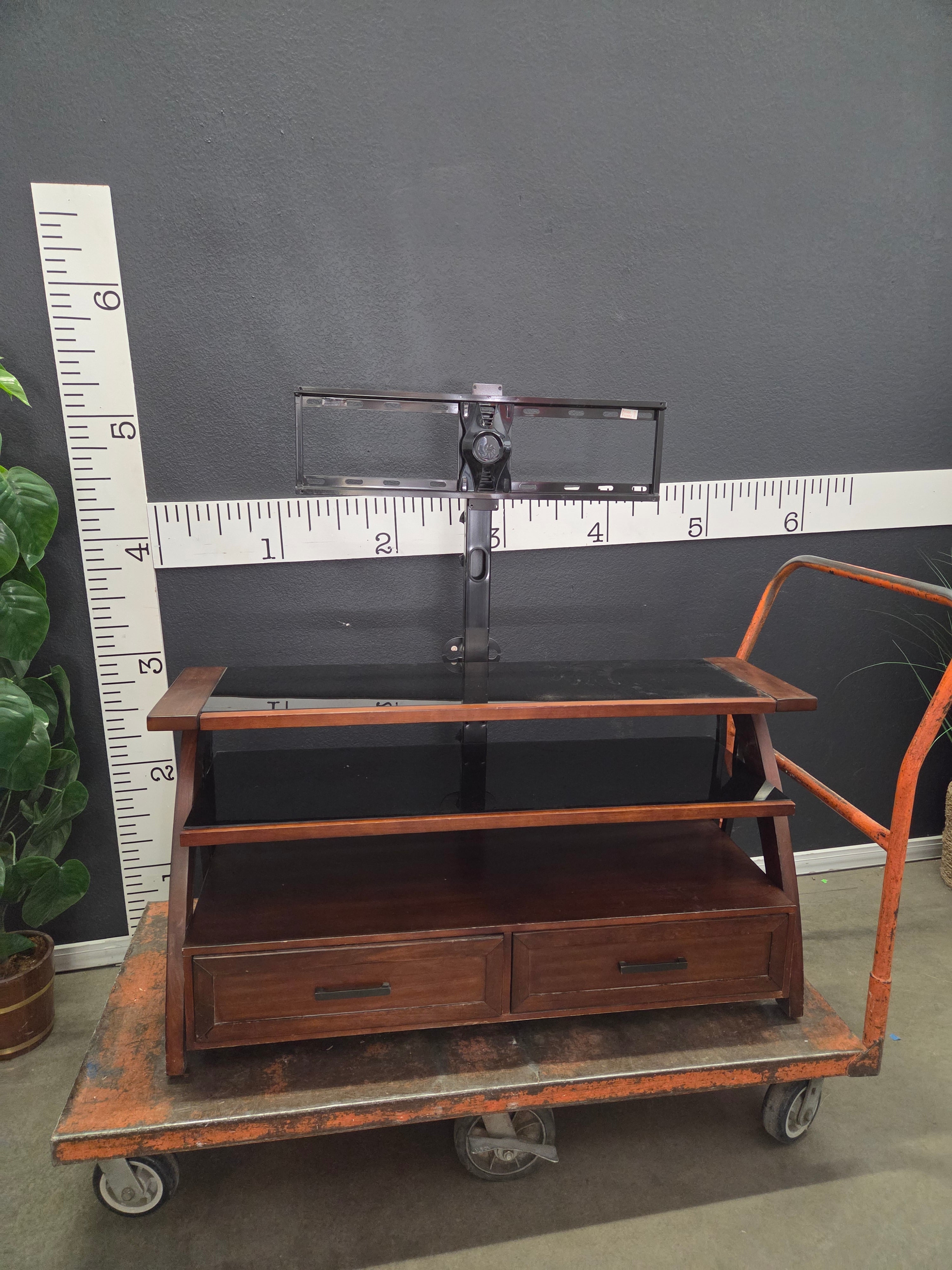This elegant TV stand features a rich brown wood finish with sleek black glass shelves. Perfect for organizing your media devices, it includes a built-in mount for your TV. Its durable construction ensures long-lasting use. Approximate Size: 4 x 5 x 1.5