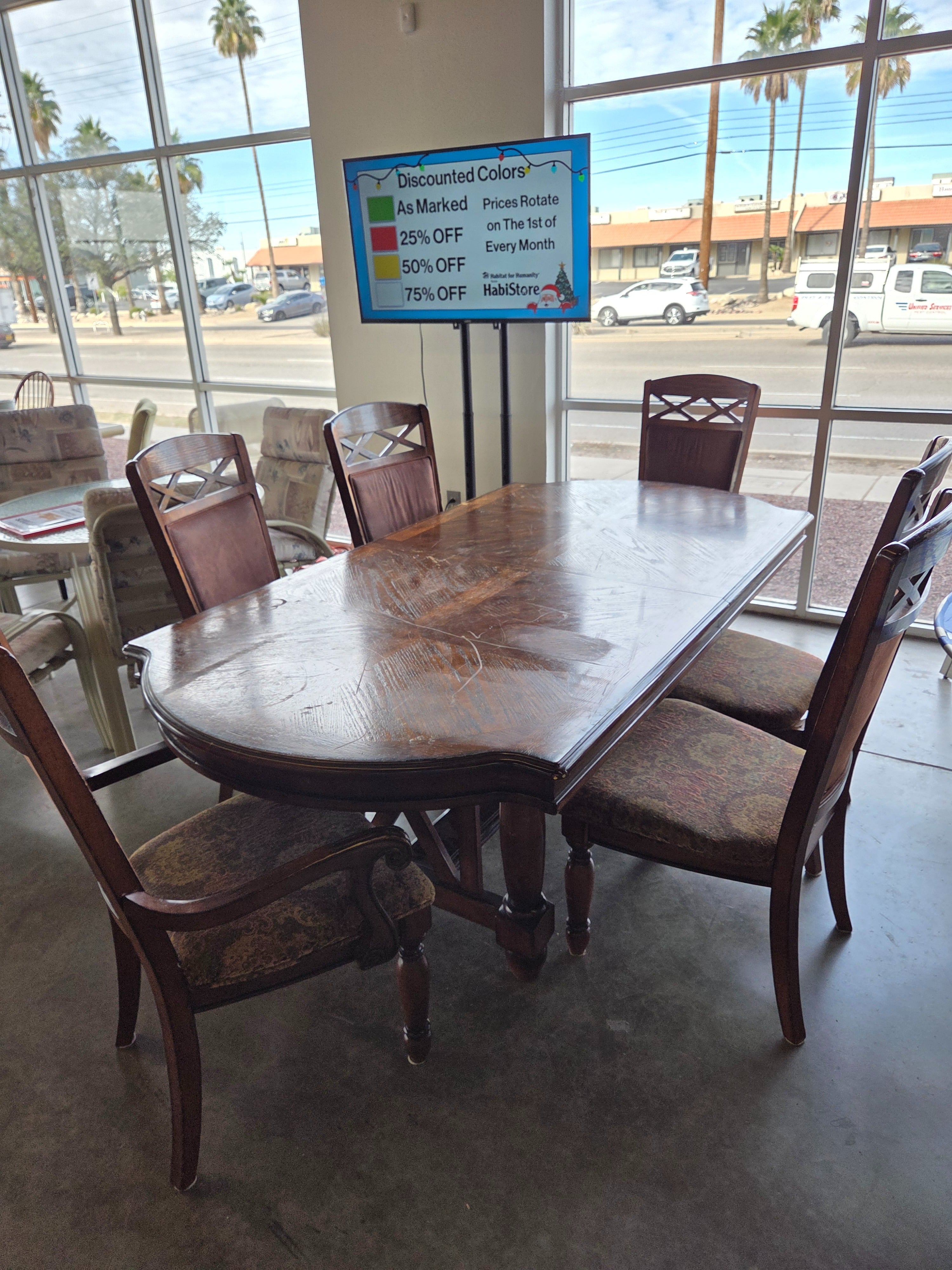 This elegant dining set features a richly finished wooden table with a classic design. The dark wood offers a polished appearance, perfectly complemented by the fabric upholstered chairs in a vintage pattern. Ideal for enhancing your dining room with timeless style. Approximate Size: 2.5 x 6 x 3