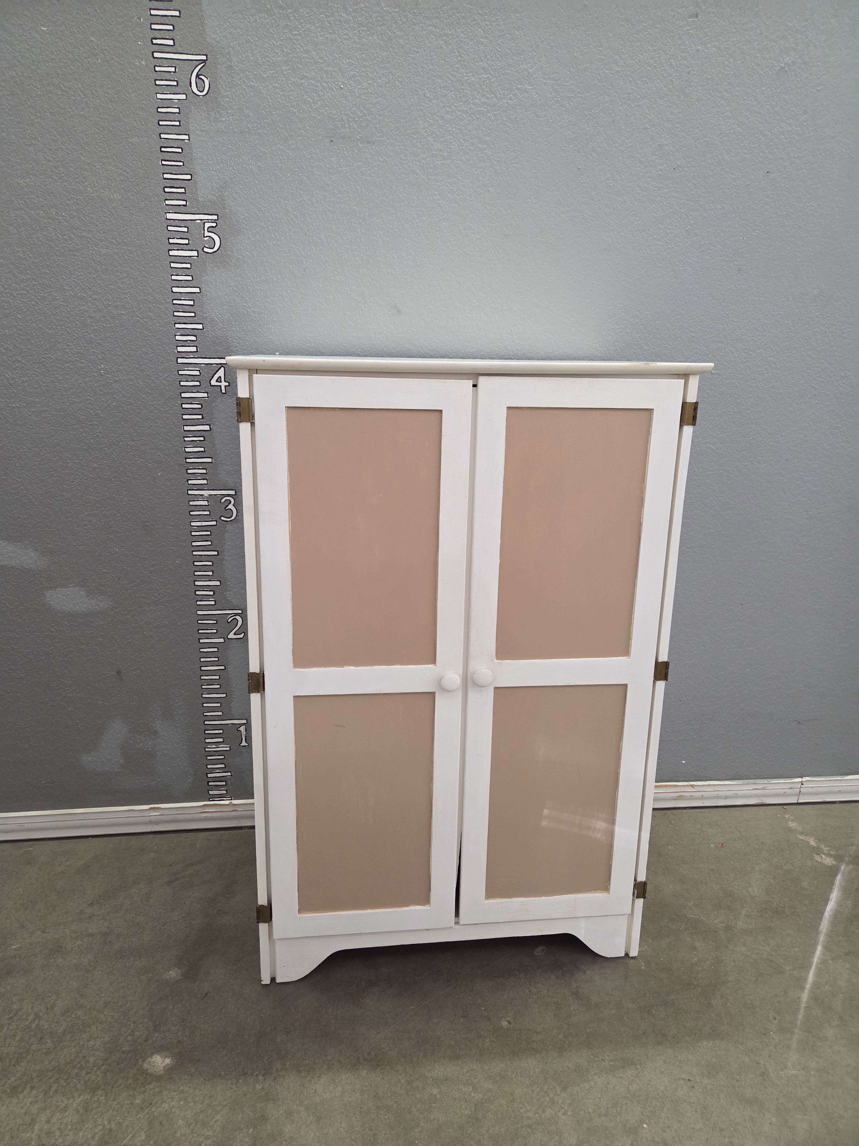 This elegant cabinet features a two-tone finish with white framing and soft beige door panels. Its smooth wooden construction provides a classic and clean appearance, making it an excellent addition to any living space. Approximate Size: 4 x 2 x 1