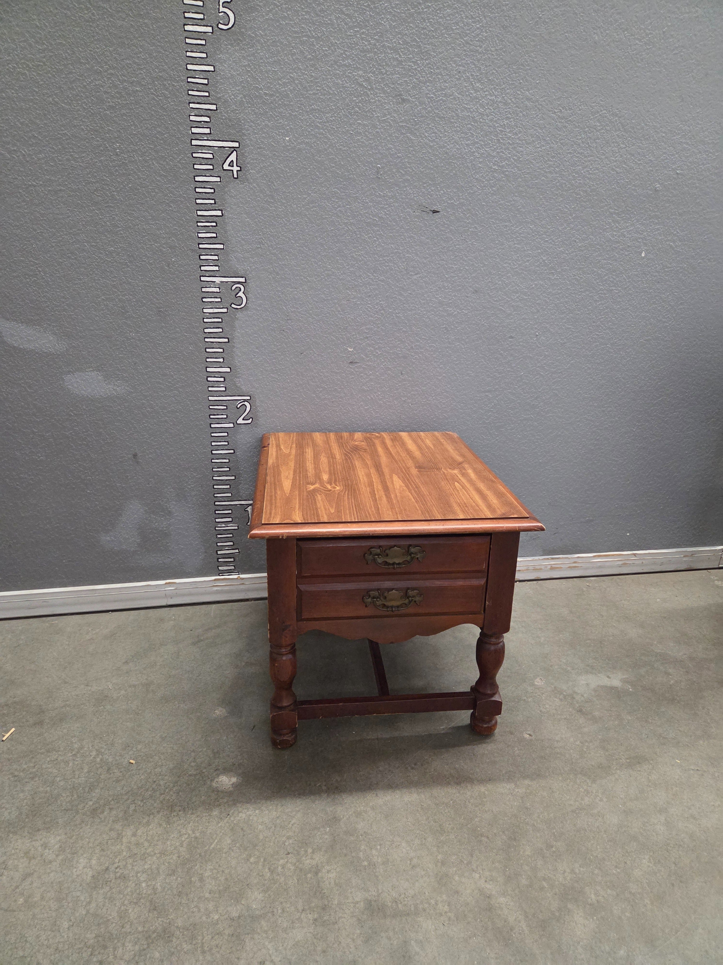 This classic vintage end table features a rich brown wood finish with ornate drawer pulls. The sturdy construction and elegant design make it perfect for adding a touch of traditional charm to any living space. Approximate Size: 2 x 1.5 x 1.5