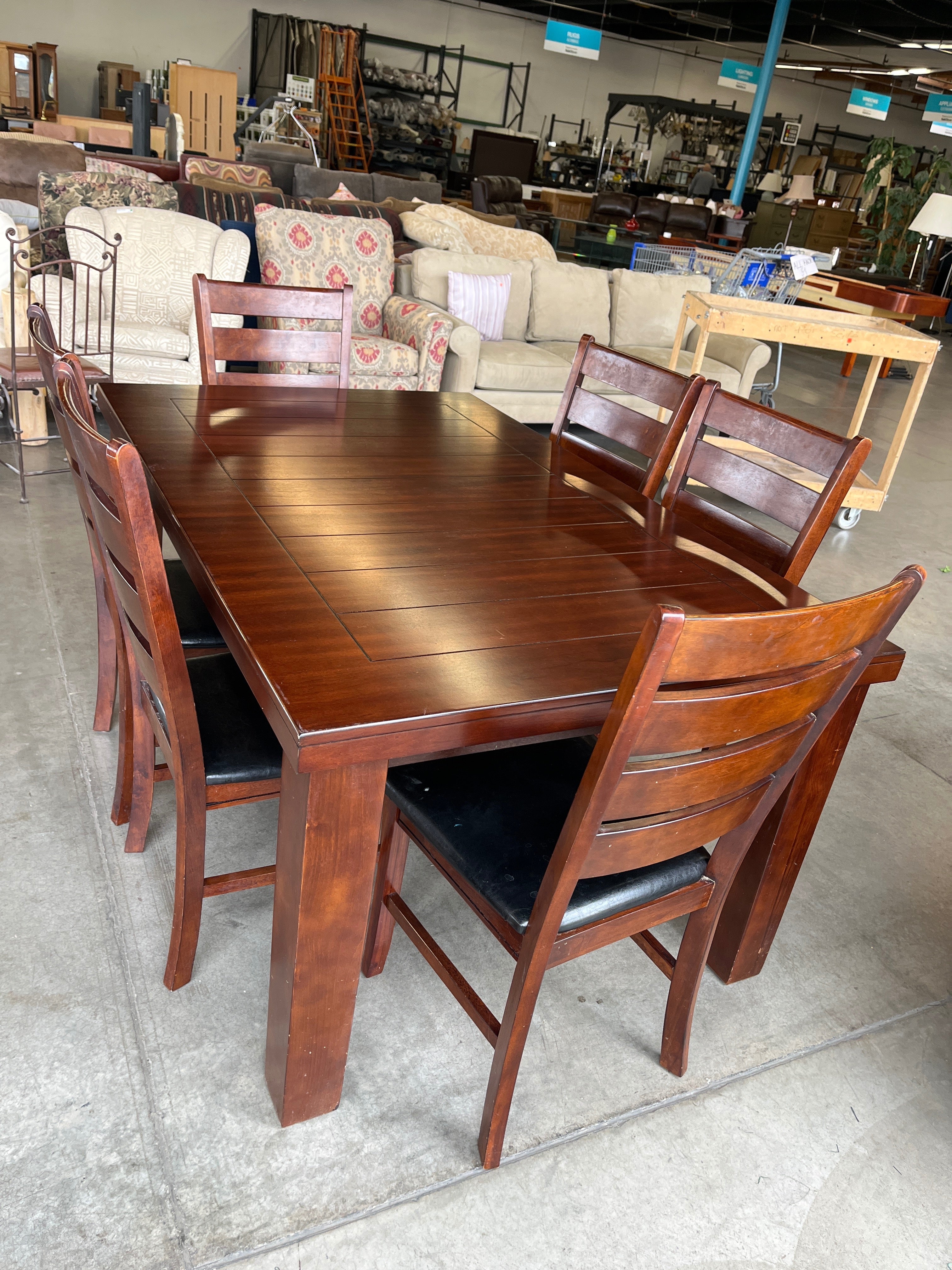This elegant dining set features a rich cherry wood finish with sturdy ladder-back chairs. The table and chairs have a smooth, polished finish, and the seats are upholstered in a classic black leather-like fabric. Approximate Size: 2.5 x 6 x 3