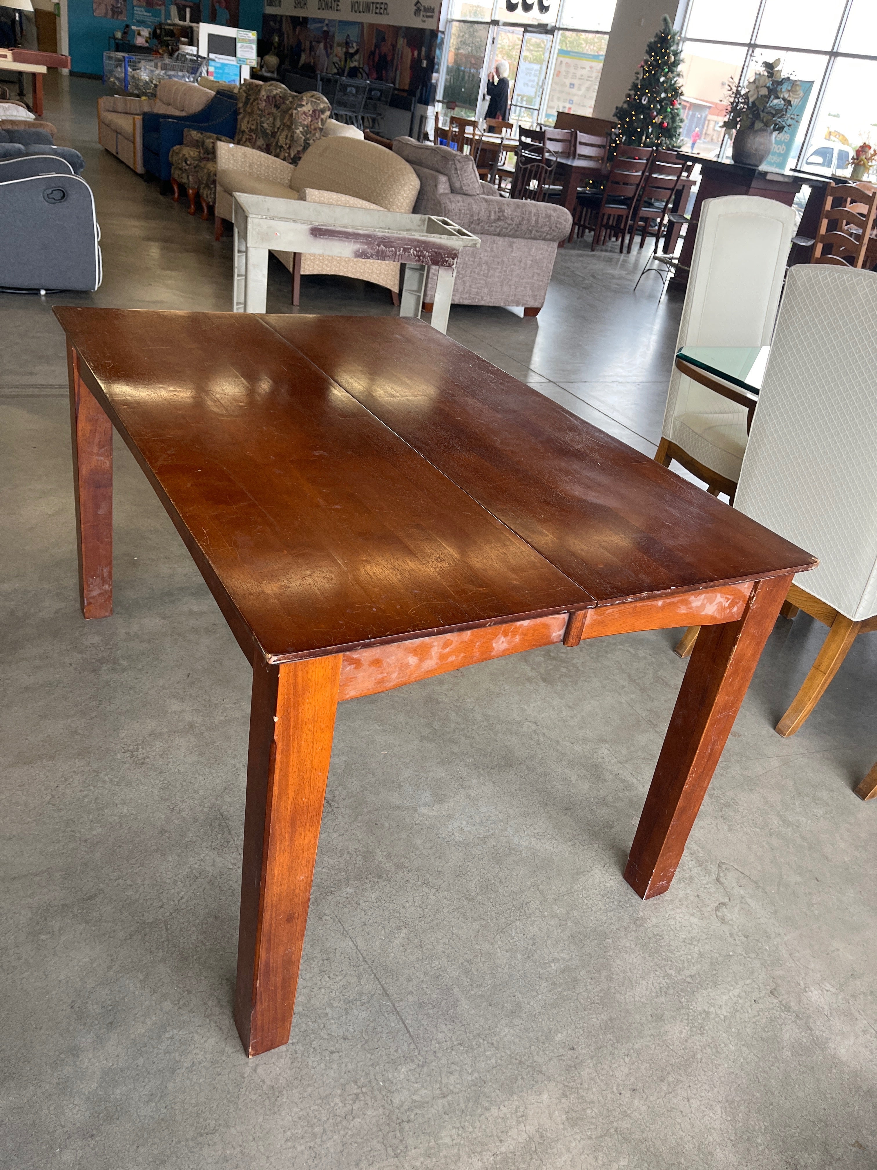 This charming dining table features a rich brown wood finish, offering a warm and classic appeal to any dining room setting. Its sturdy construction ensures durability and timeless style. Approximate Size: 2.5 x 5 x 3