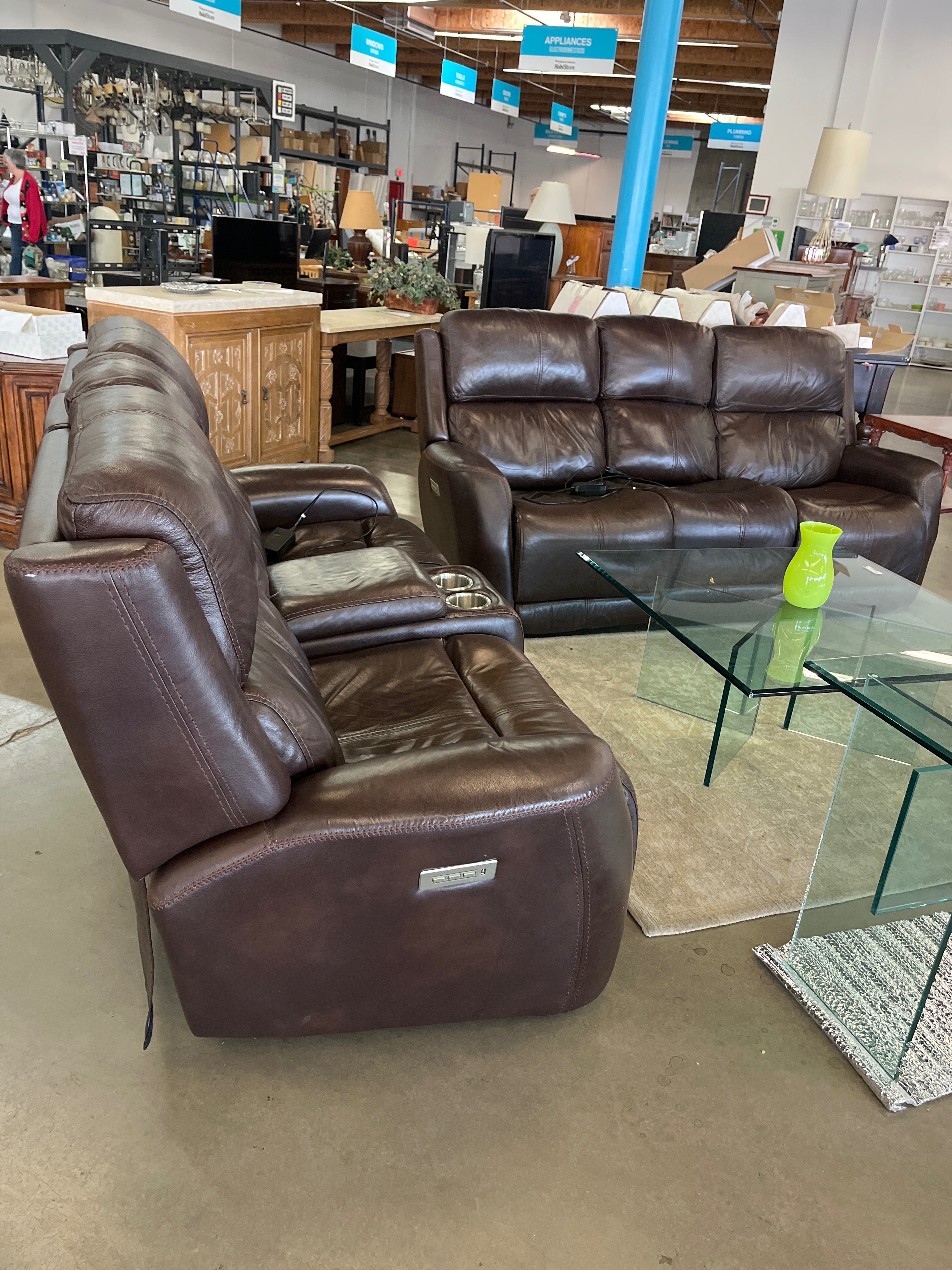 This luxurious sofa set is upholstered in a rich brown leather with a smooth, polished finish. Perfect for adding comfort and style to your living room. Approximate Size: 3 x 6 x 3