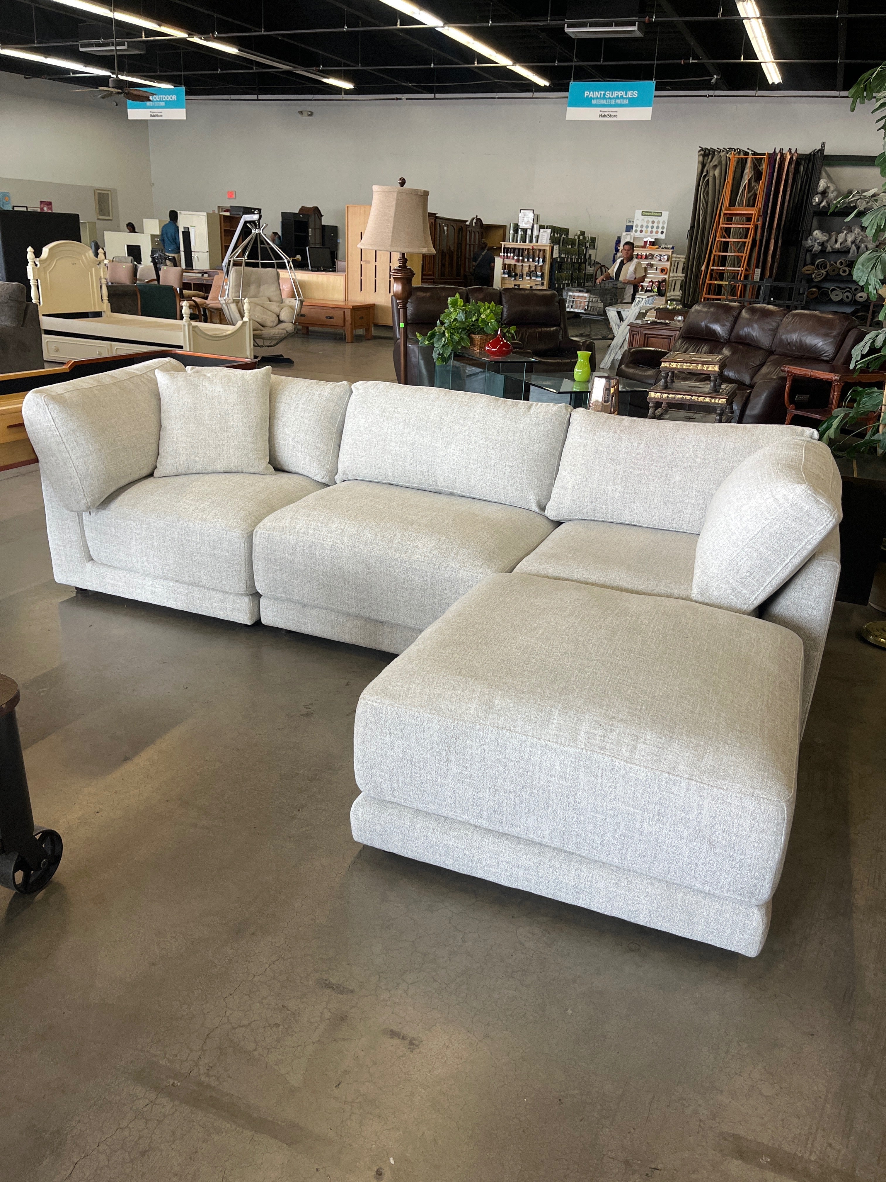 This elegant sectional sofa is upholstered in a soft, light gray fabric with a smooth finish. It features a chaise for added comfort and relaxation, perfect for any contemporary living room setup. Approximate Size: 3 x 8 x 5