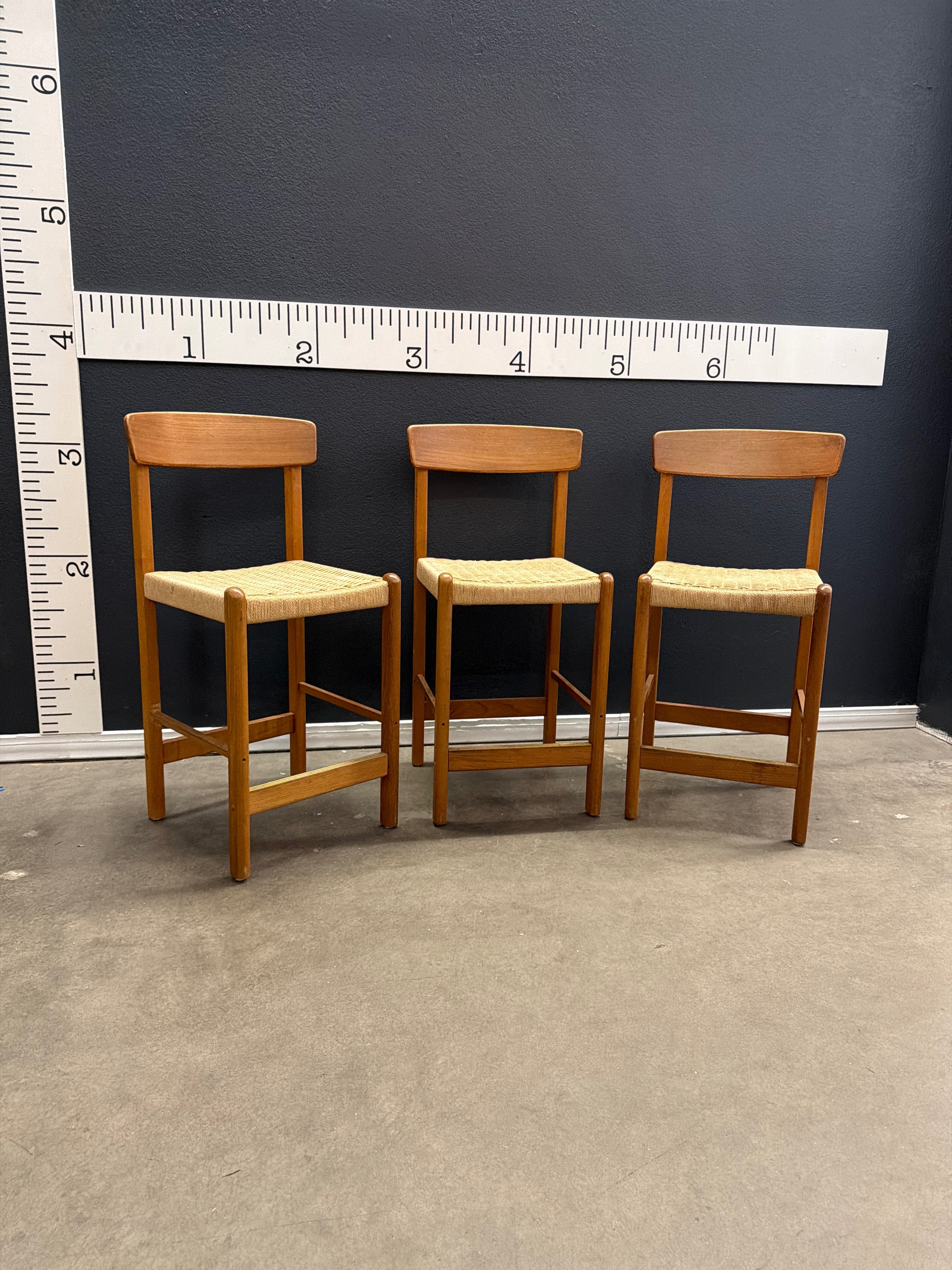 Set of three wooden bar stools featuring a warm, light brown wood finish and woven fabric seats. Perfect for adding a touch of mid-century modern style to your home. Approximate Size: 3 x 1.5 x 1.5