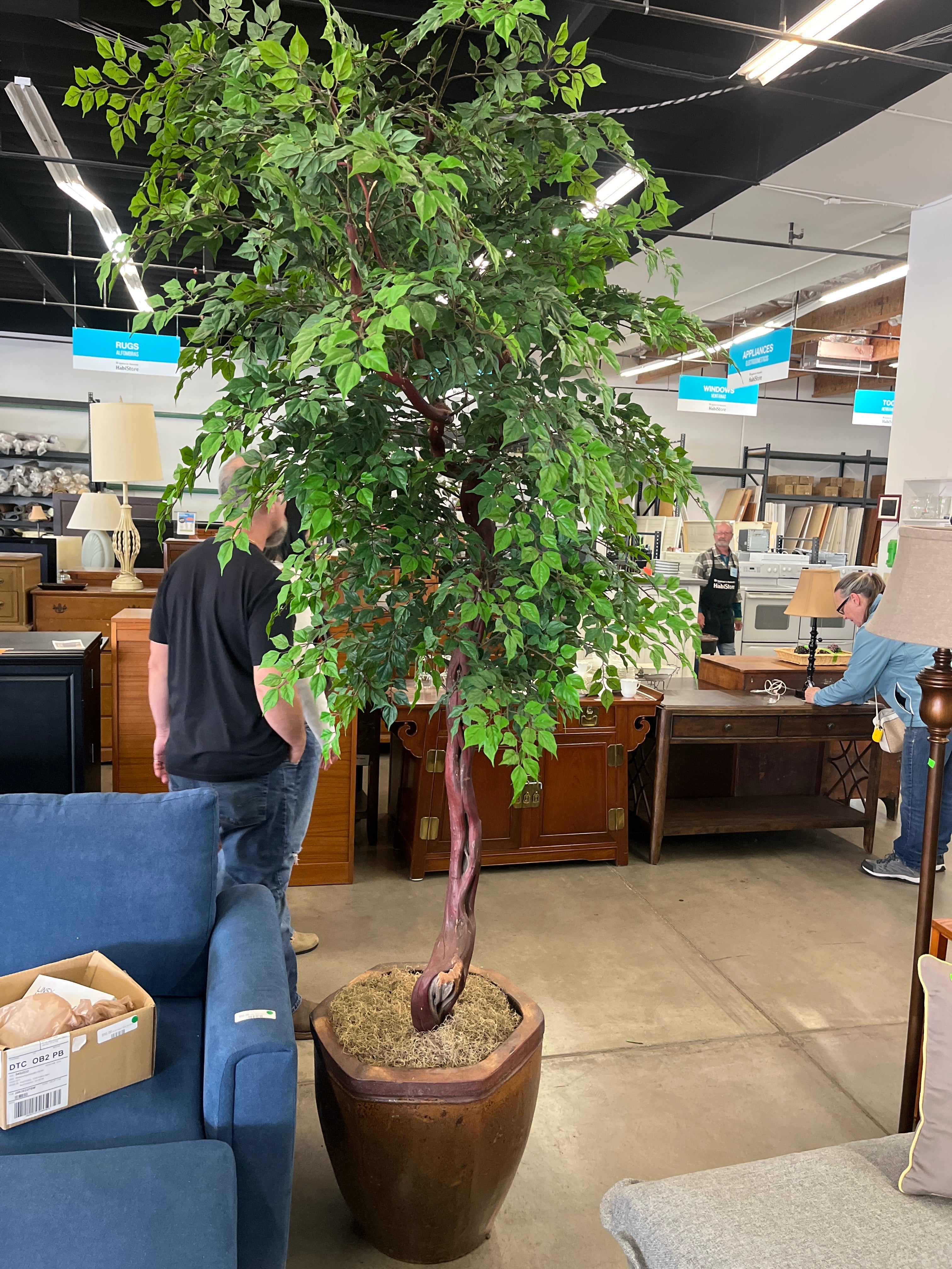 This vibrant artificial Ficus tree features lush green leaves with a natural finish and is set in a rustic brown planter. Perfect for adding a touch of nature to any room without the maintenance. Approximate Size: 7 x 3 x 3