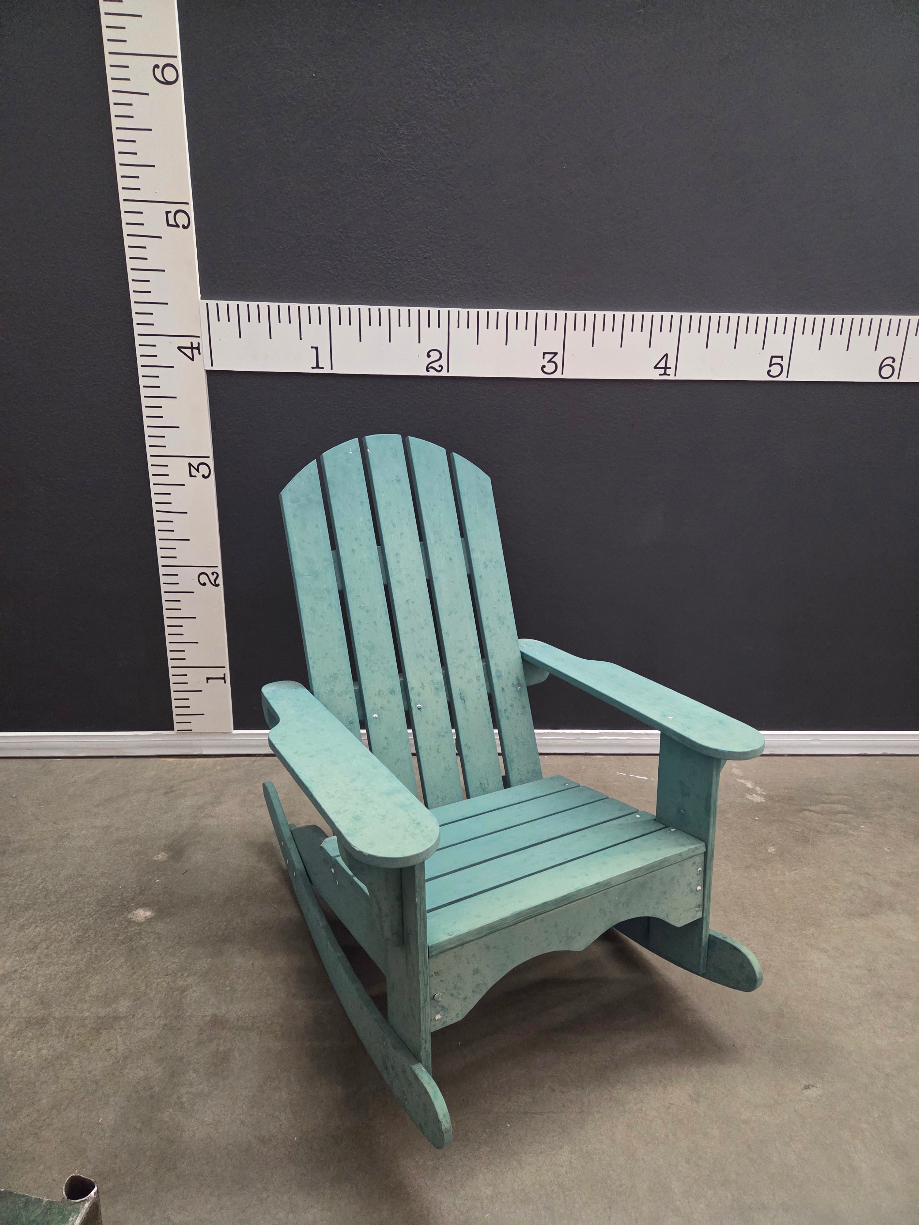 A charming turquoise rocking chair made from durable wood. It features a rustic finish, perfect for both indoor and outdoor relaxation. Approximate Size: 4 x 2 x 2.5