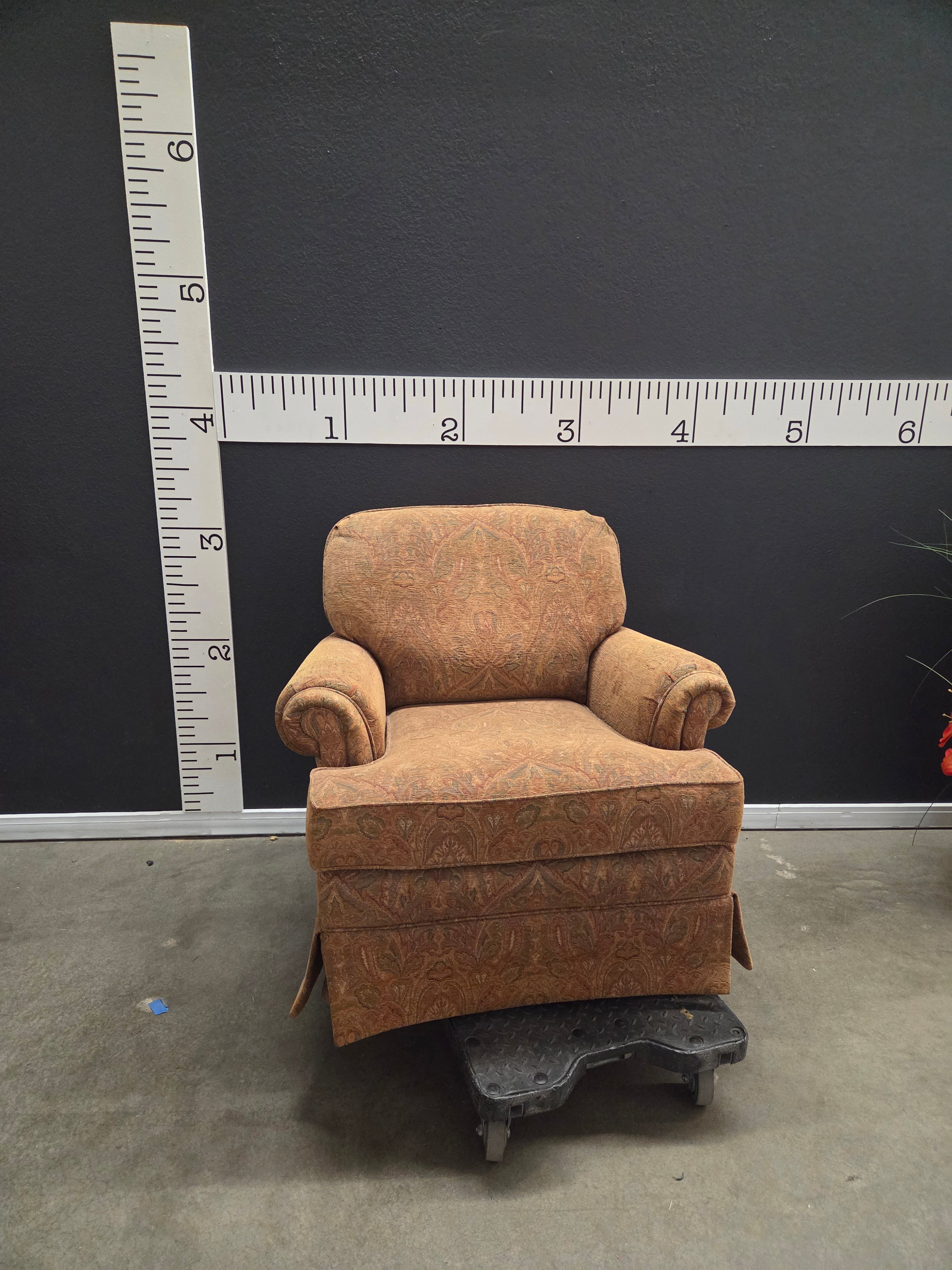 This vintage armchair features a warm, earth-toned paisley fabric with a soft, upholstered finish. Its traditional design includes rolled arms and a skirted base. Approximate Size: 3 x 2.5 x 3
