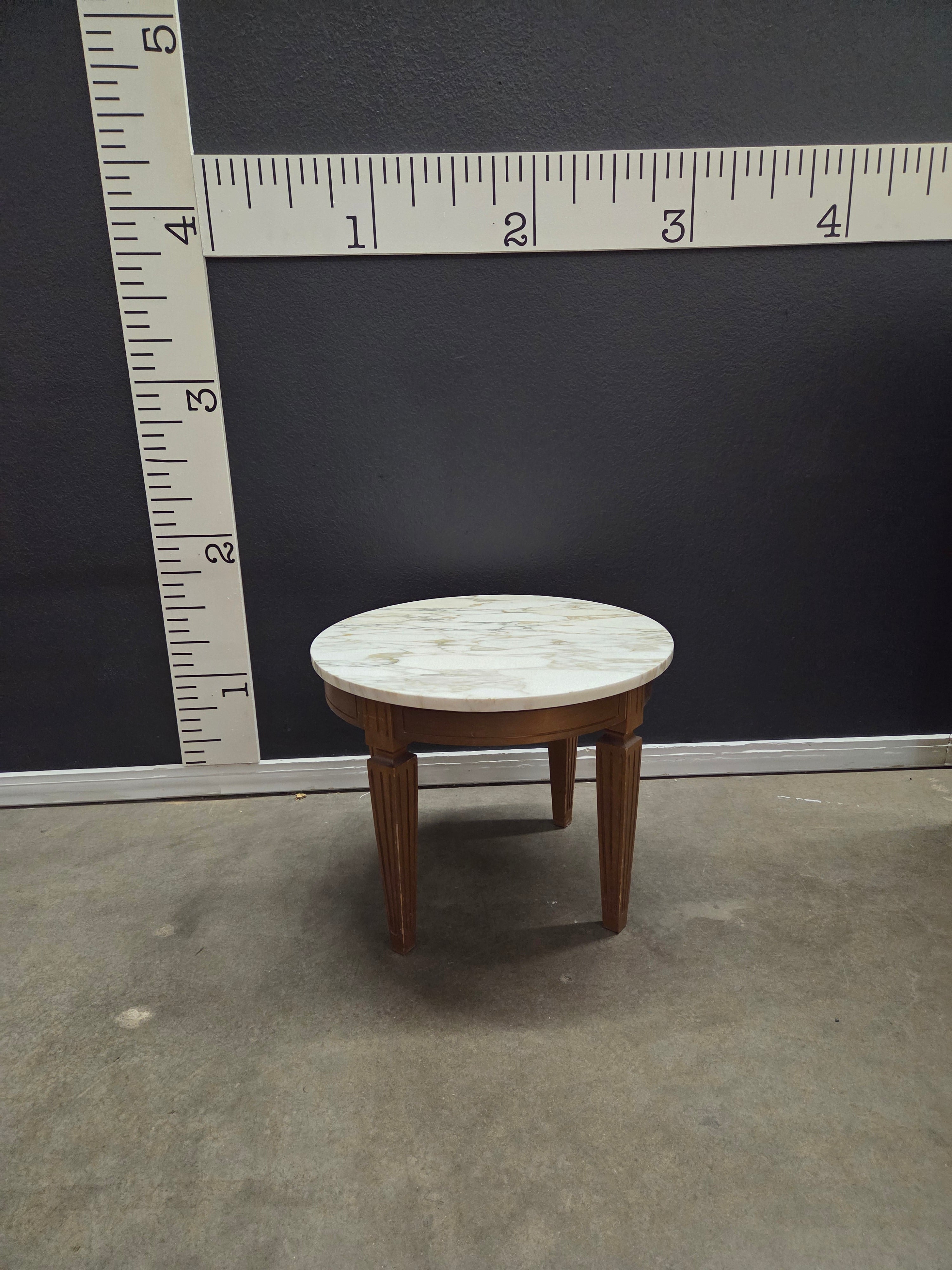 This elegant side table features a round marble top with a polished finish and a warm wooden frame. The legs are slightly tapered, giving it a classic and timeless look perfect for any setting. Approximate Size: 2 x 1.5 x 1.5