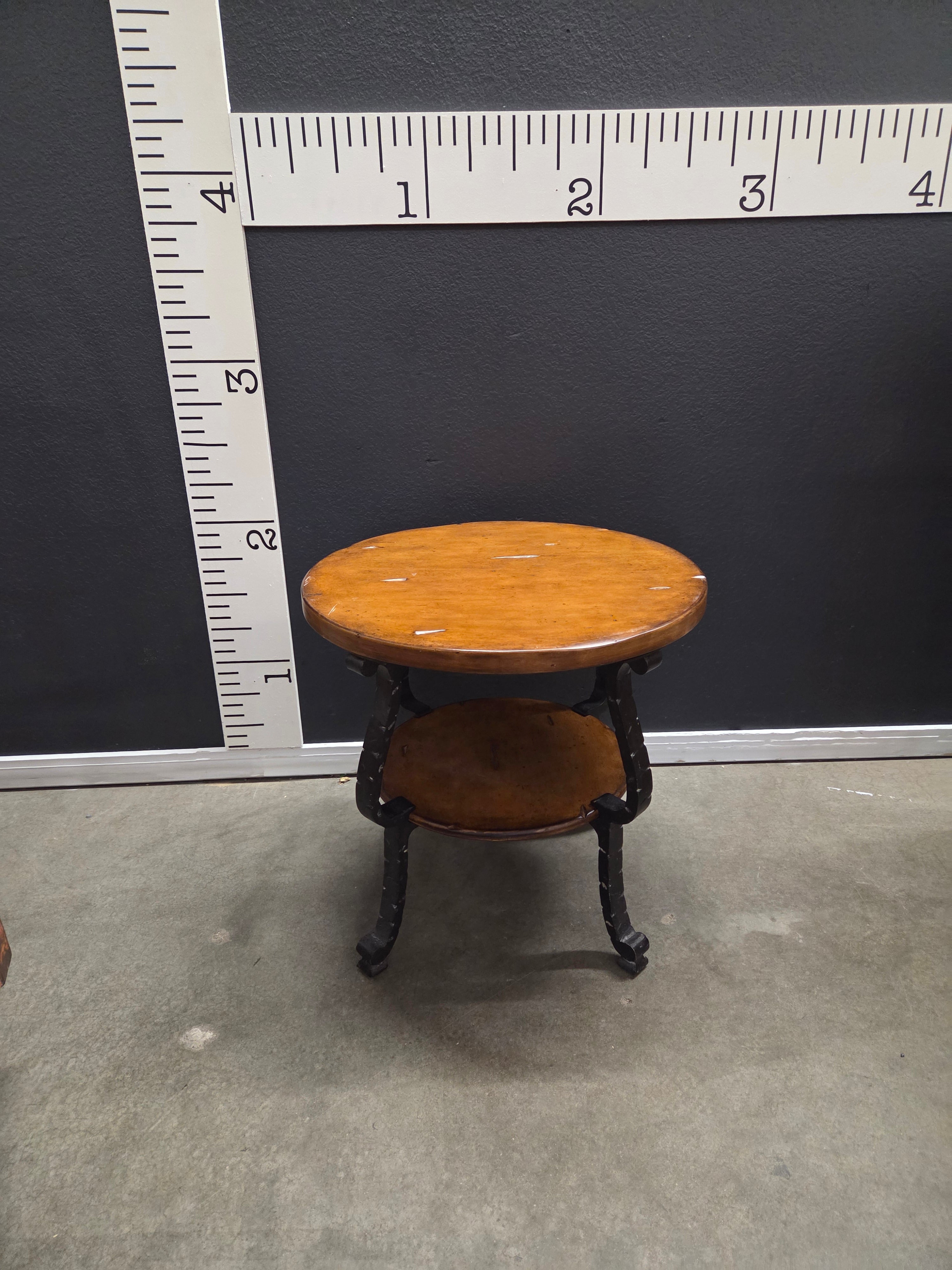 This charming vintage side table features a warm, polished brown wood finish. Its two-tier design offers additional storage space, supported by elegantly curved black legs, making it a versatile piece for any living space. Approximate Size: 2.5 x 1.5 x 1.5