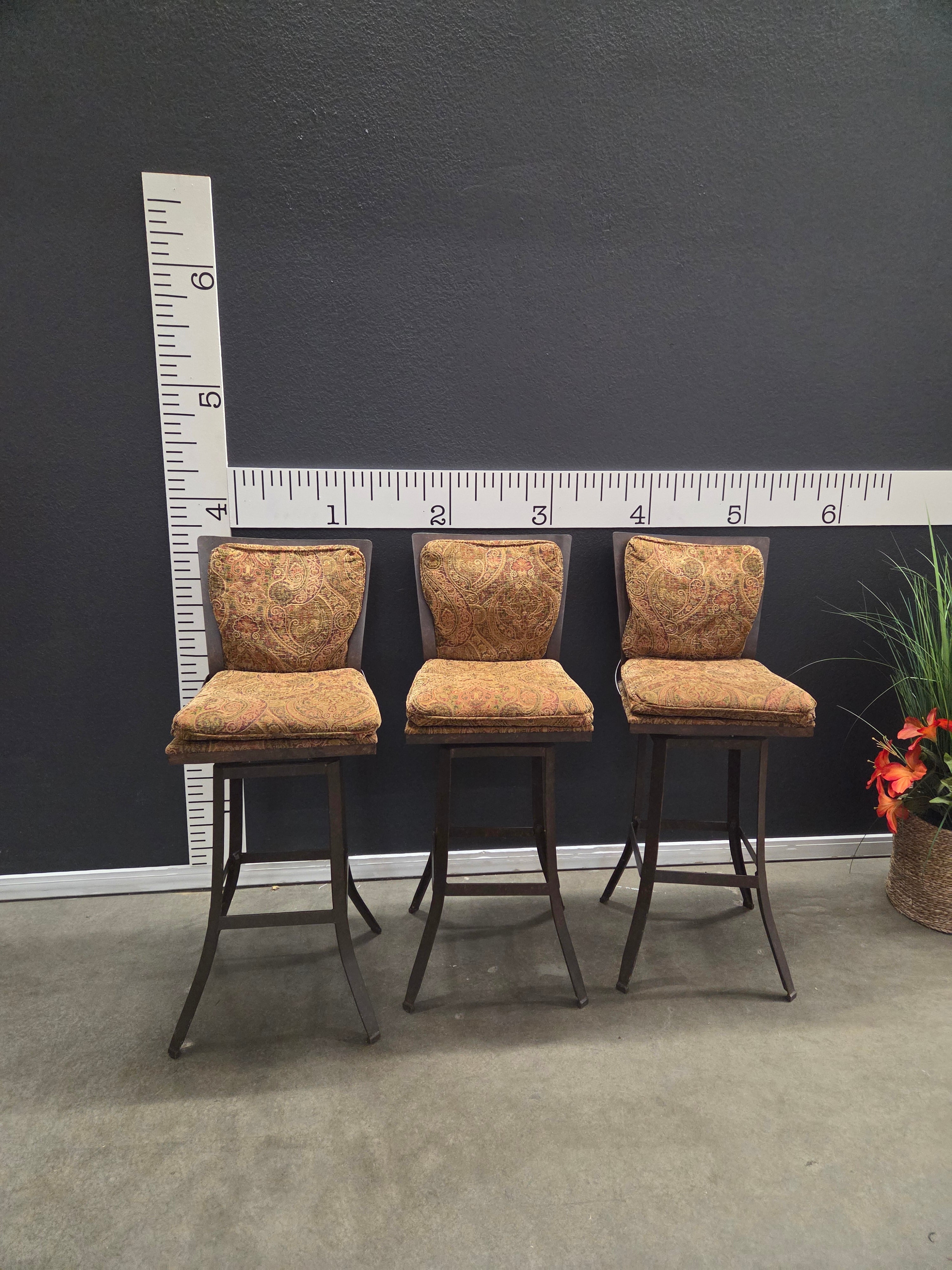 These stylish bar stools feature a paisley-patterned fabric in warm earthy tones, which creates a comfortable and sophisticated seating option. The metal frame has a dark bronze finish, adding to its elegant appearance. Approximate Size: 4 x 1.5 x 1.5
