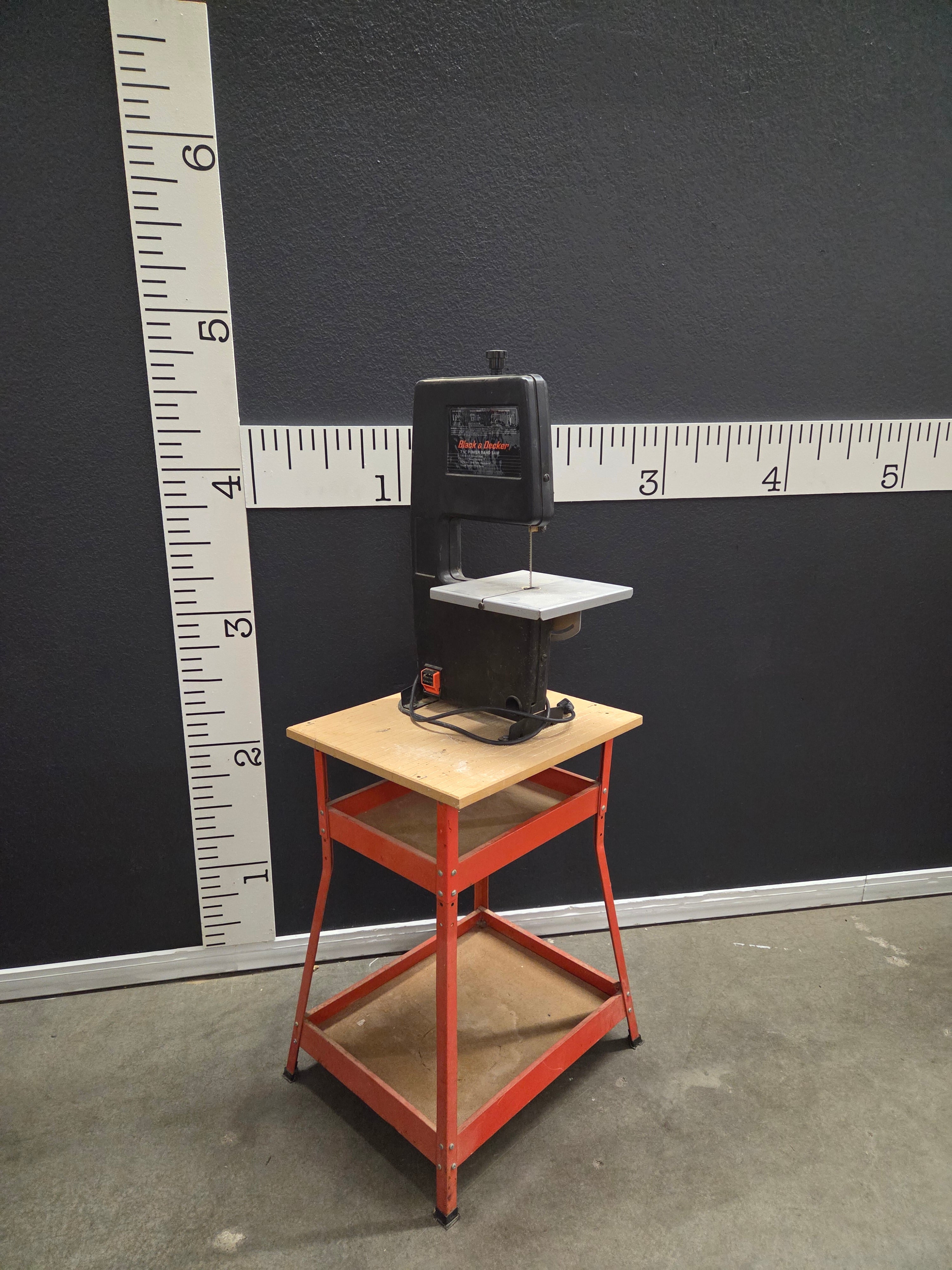 This vintage Black & Decker band saw features a durable black cast metal finish with a sleek, compact design. It is mounted on a sturdy red metal stand with a wooden top and bottom shelf. Ideal for precise cutting in your workshop. Approximate Size: 4 x 2 x 2