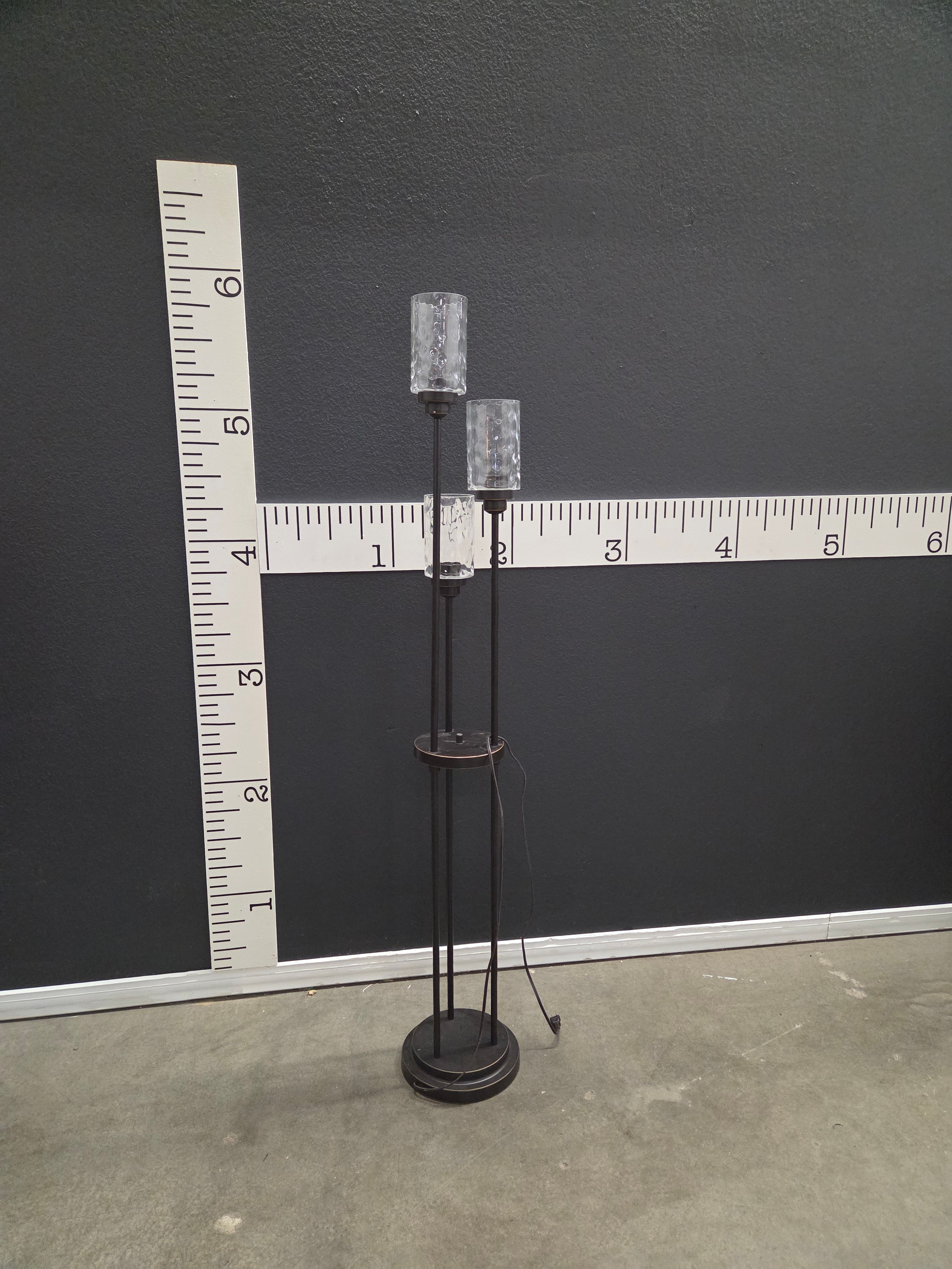 This elegant floor lamp features a dark bronze finish with two captivating textured glass shades, providing a warm and inviting glow. The simple yet stylish design complements any living room décor. Approximate Size: 6 x 1 x 1