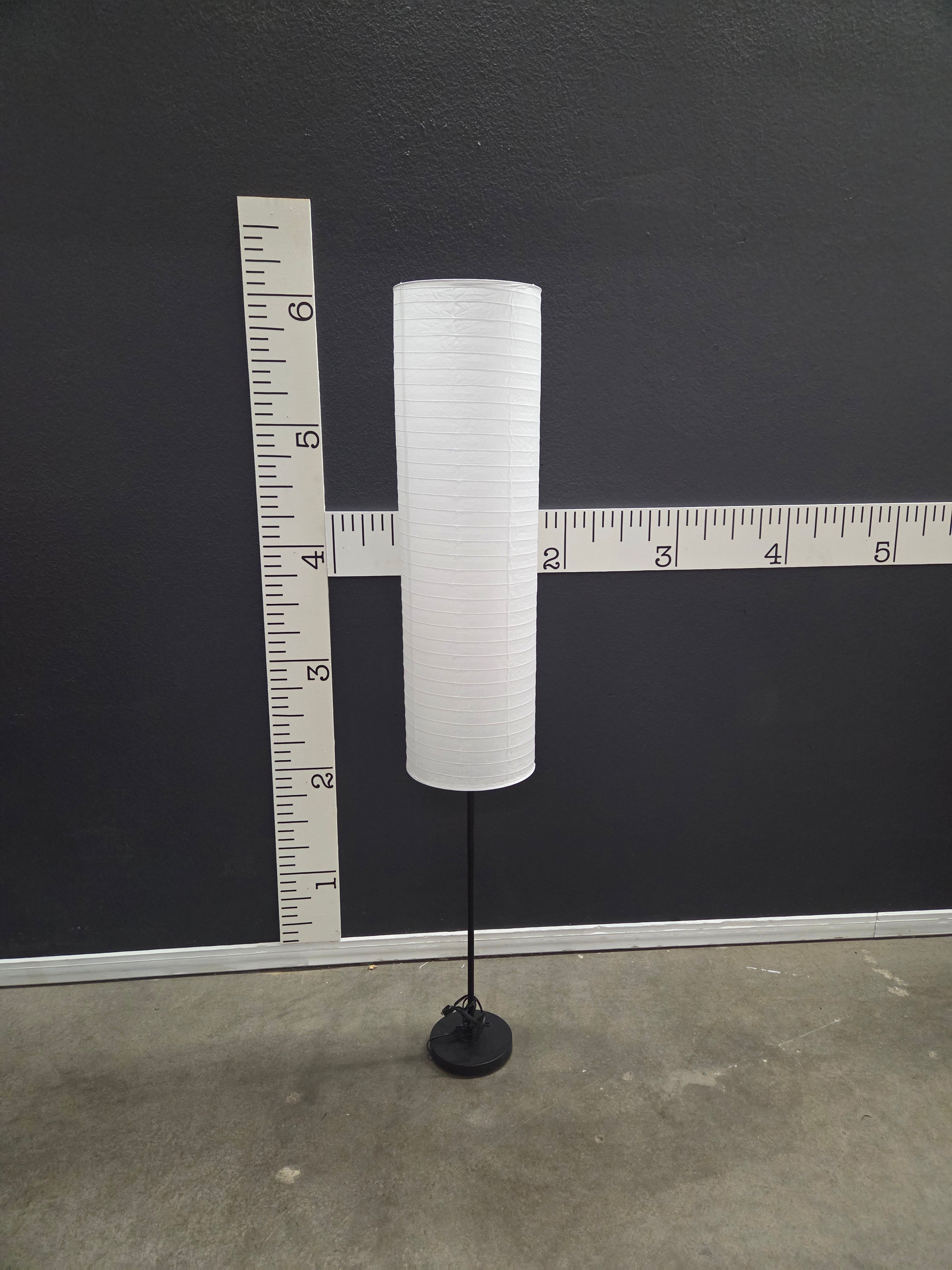 This sleek floor lamp features a white cylindrical shade with a smooth fabric finish, offering a clean and contemporary look. The base is sturdy and complements the overall minimalist design. Approximate Size: 5 x 0.75 x 0.75