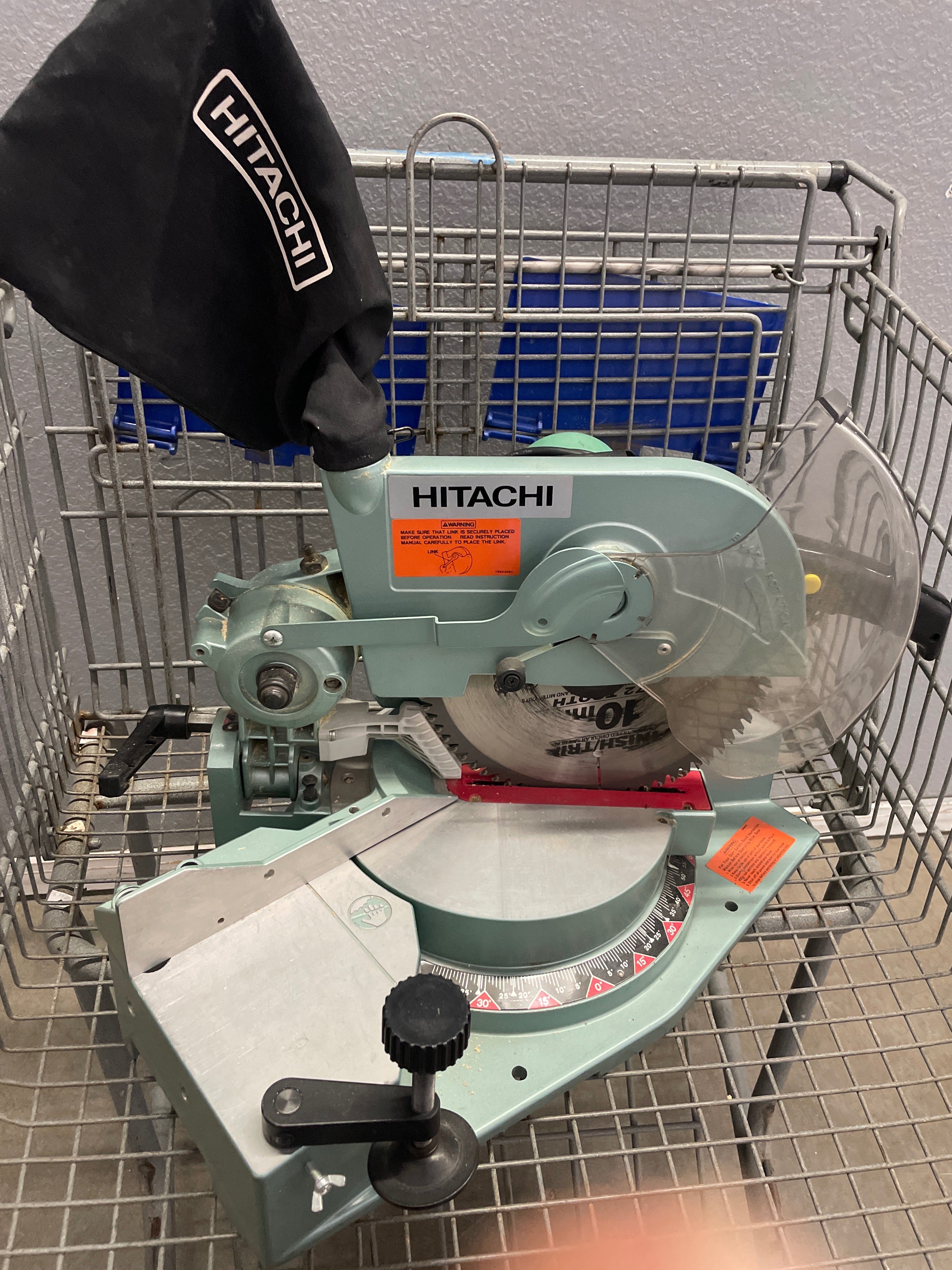 This Hitachi compound miter saw features a durable silver and green finish, designed for precision cutting in woodworking projects. Approximate Size: 1.5 x 2 x 2