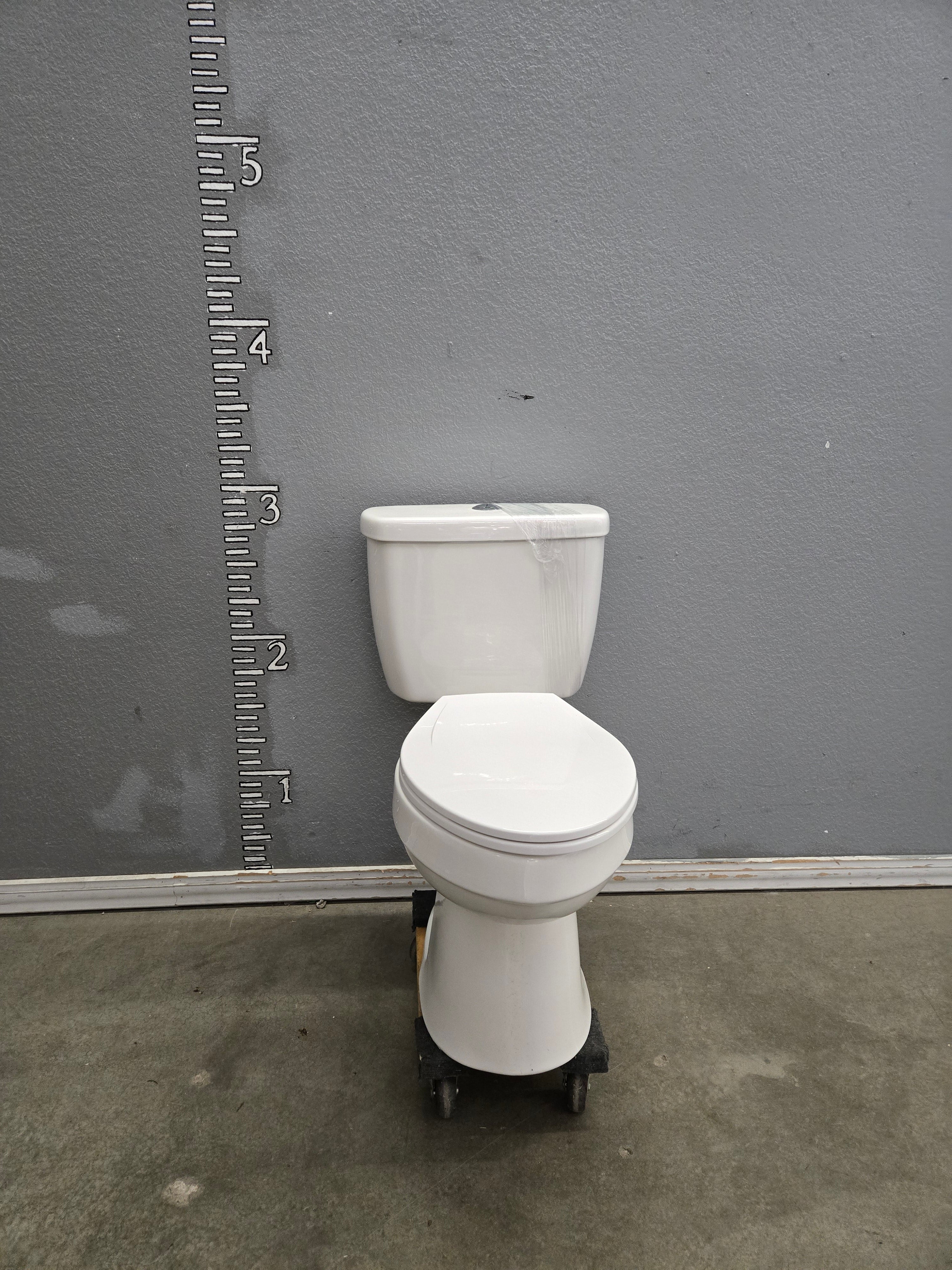 This toilet features a sleek white ceramic finish, providing a clean and modern look suitable for any bathroom. Its two-piece design ensures easy installation and maintenance. Approximate Size: 2.5 x 1.5 x 2