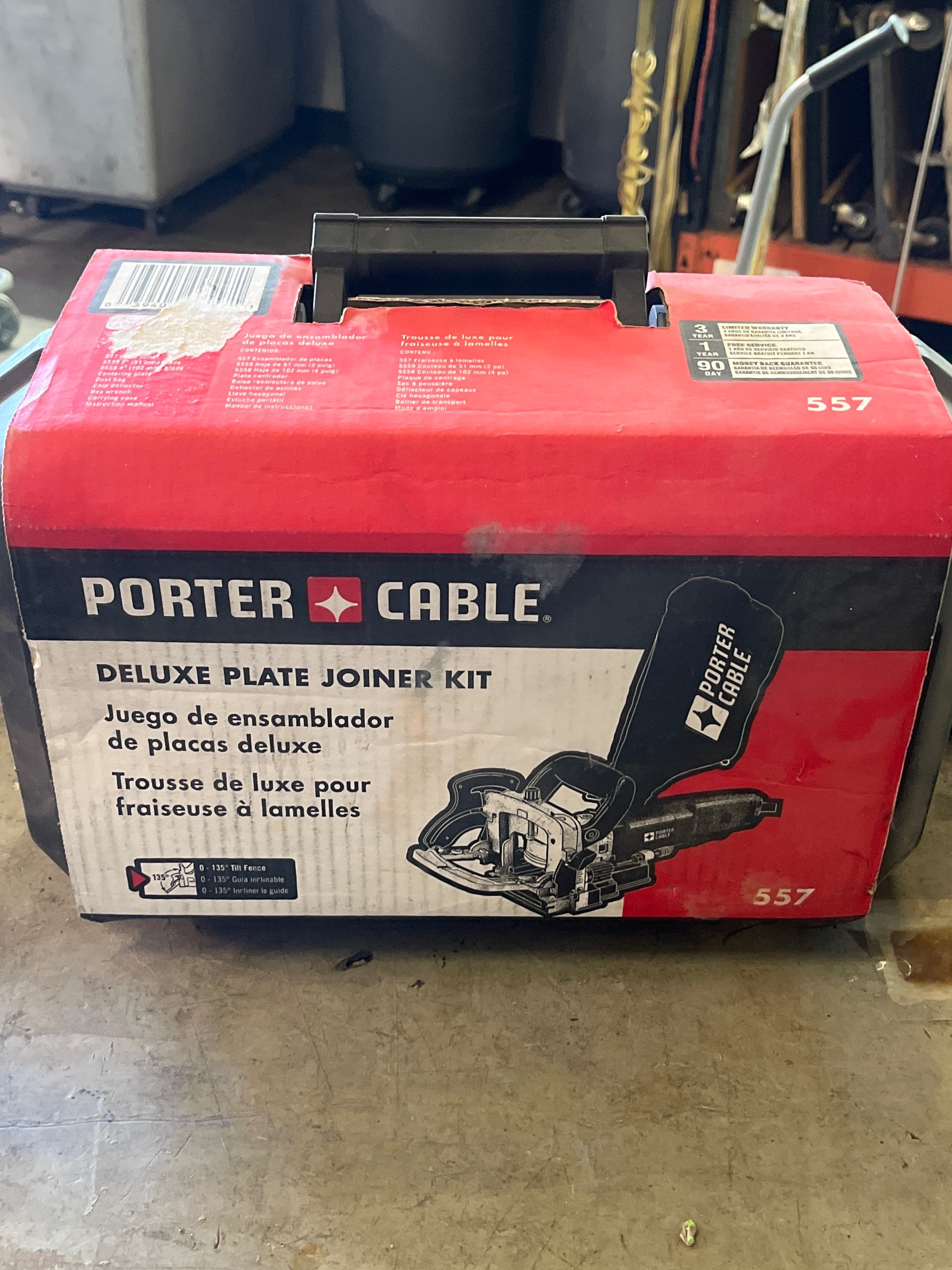 The Porter-Cable Deluxe Plate Joiner Kit features a robust design with a durable metal finish. The red and black packaging is sturdy and designed to protect the tool during transport and storage. Approximate Size: 1 x 1.5 x 0.5