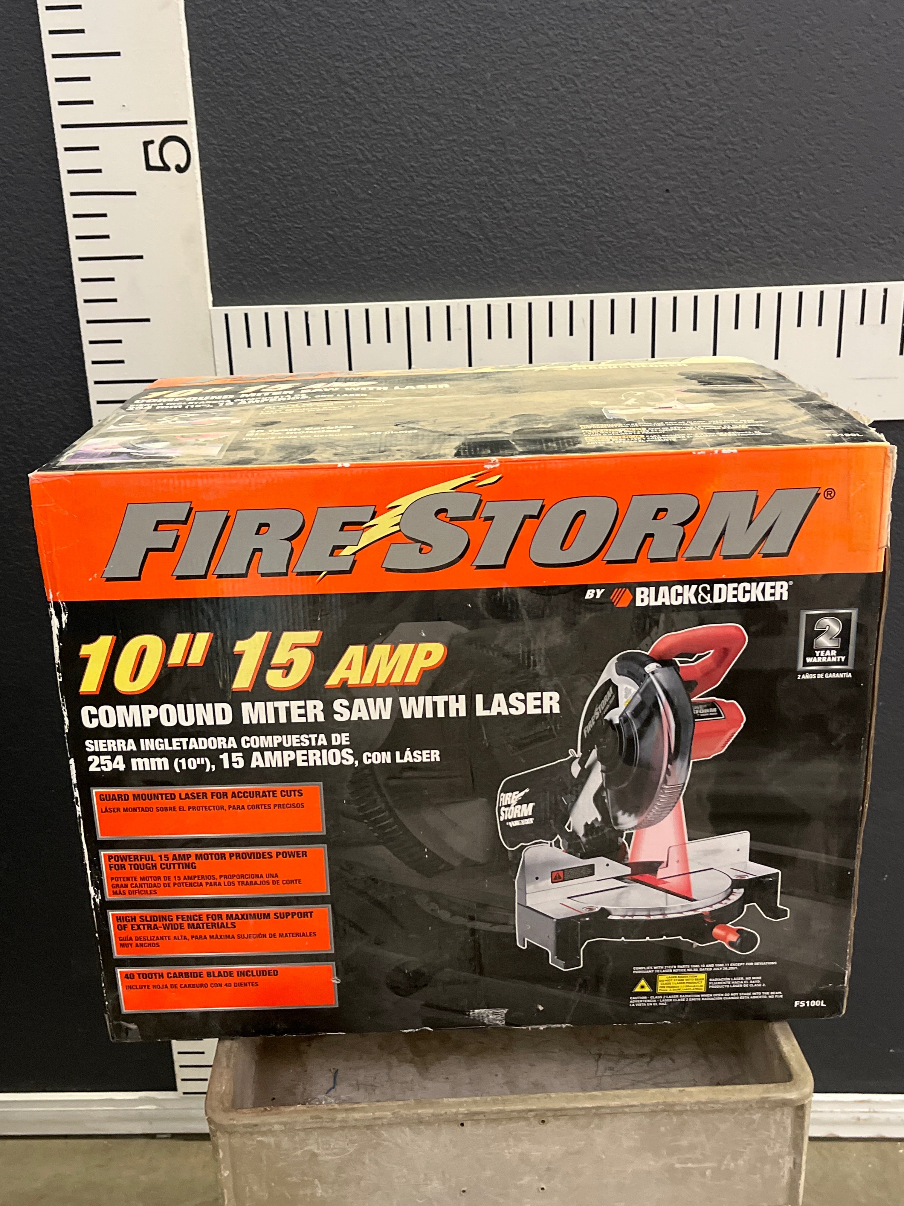 This powerful 10-inch miter saw by Firestorm features a sleek black and red finish. Equipped with a laser guide for precise cutting, the saw is perfect for both professional woodworkers and DIY enthusiasts. Approximate Size: 1.5 x 2.5 x 1