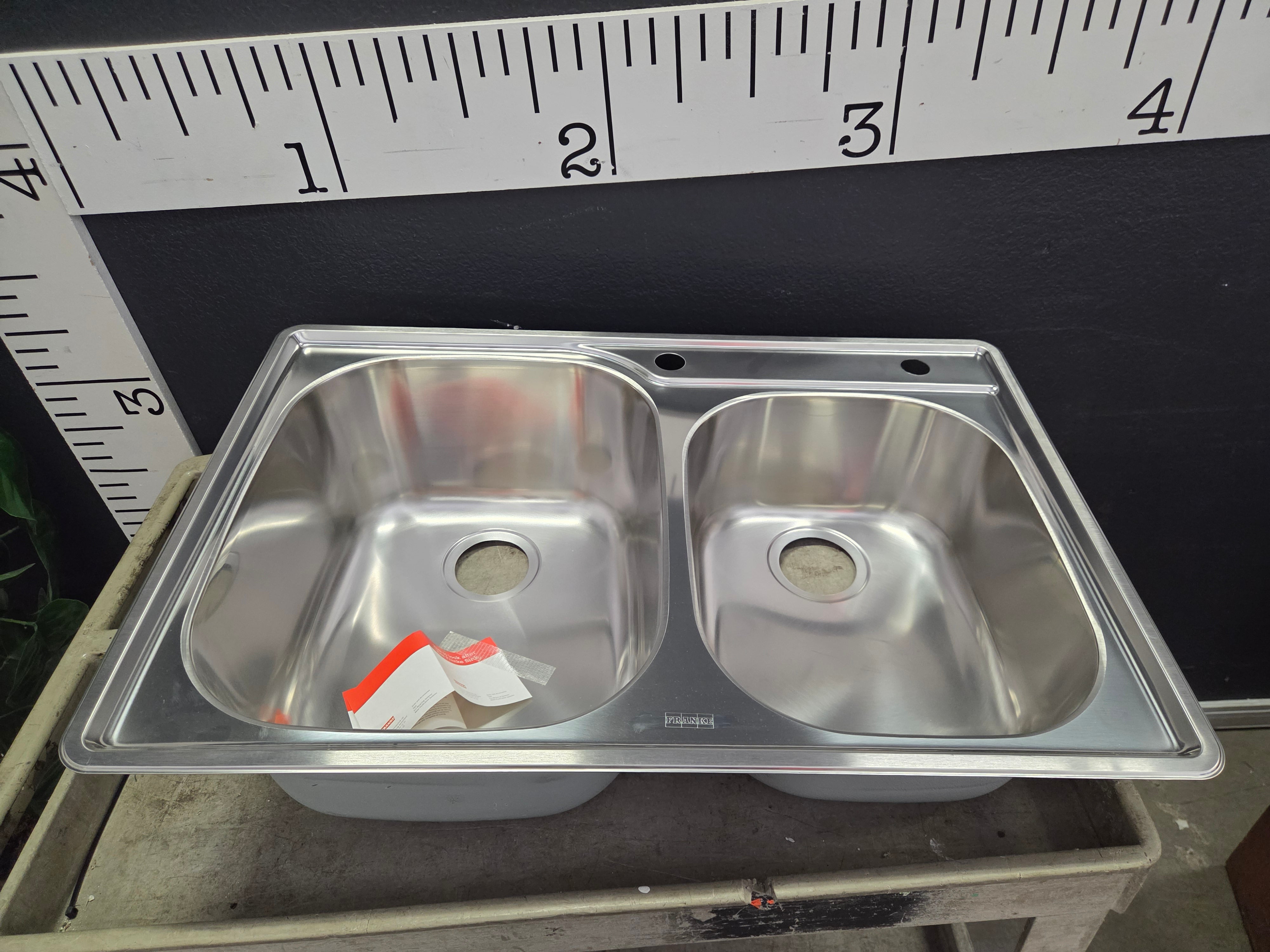 A sleek double bowl kitchen sink crafted from durable stainless steel with a brushed finish. Perfect for modern kitchen setups. Approximate Size: 1.5 x 2.5 x 0.8