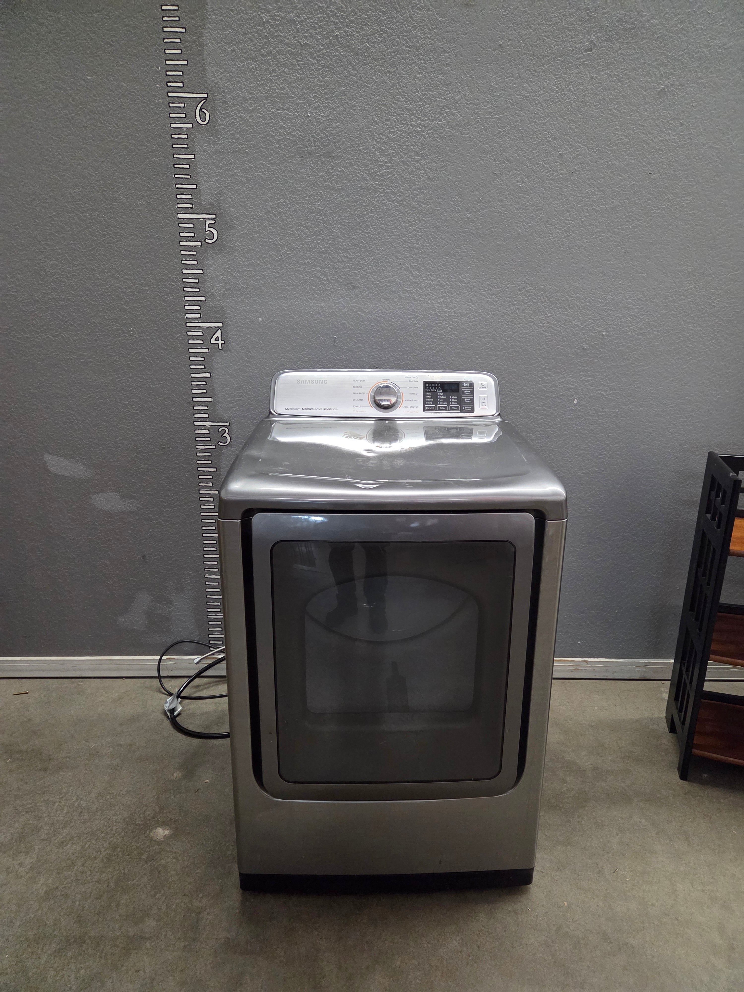 This modern gas dryer features a sleek stainless steel finish, providing a stylish look that complements any laundry room decor. Its front-loading design is both functional and elegant. Approximate Size: 4.5 x 2.5 x 2.5