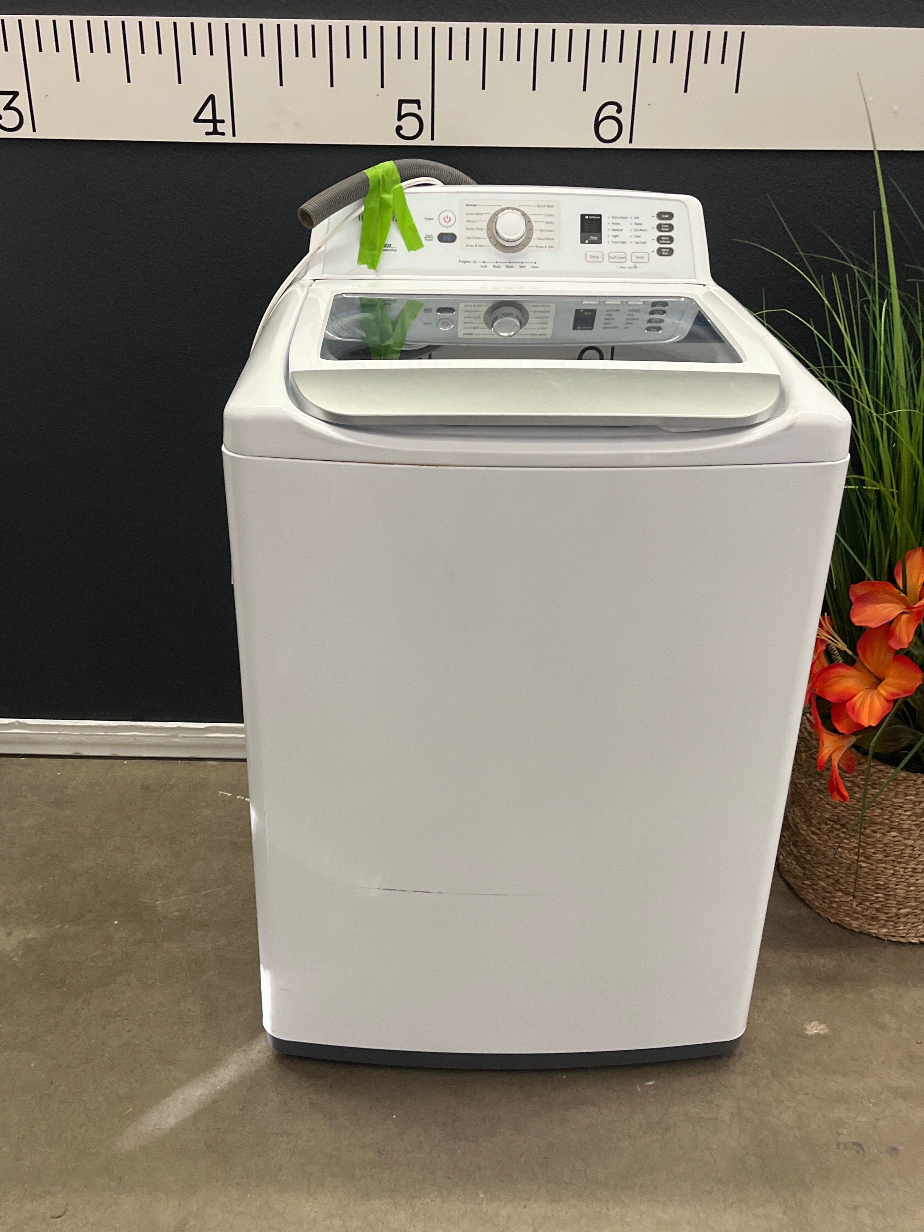 This white high-efficiency top load washer features a sleek, modern design. With a smooth finish and intuitive control panel, it adds both functionality and style to any laundry room. The washer's advanced settings allow for customizable wash cycles, ensuring optimal care for your garments. Approximate Size: 4.5 x 2 x 2