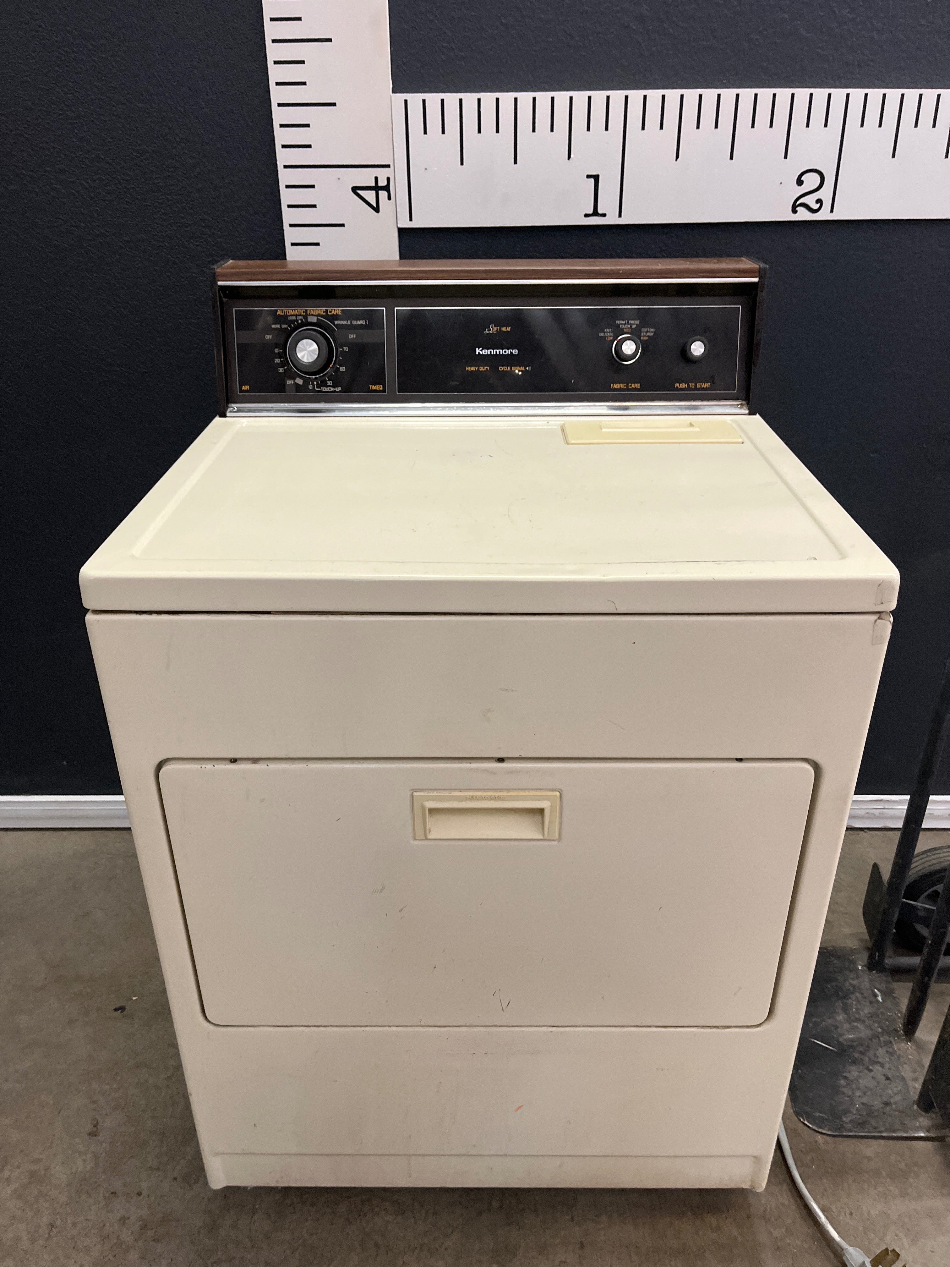 This classic white Kenmore electric dryer features a durable finish and a control panel with a woodgrain accent. Ideal for efficiently drying your laundry, it adds a retro touch to your home. Approximate Size: 3.5 x 2.5 x 2.5