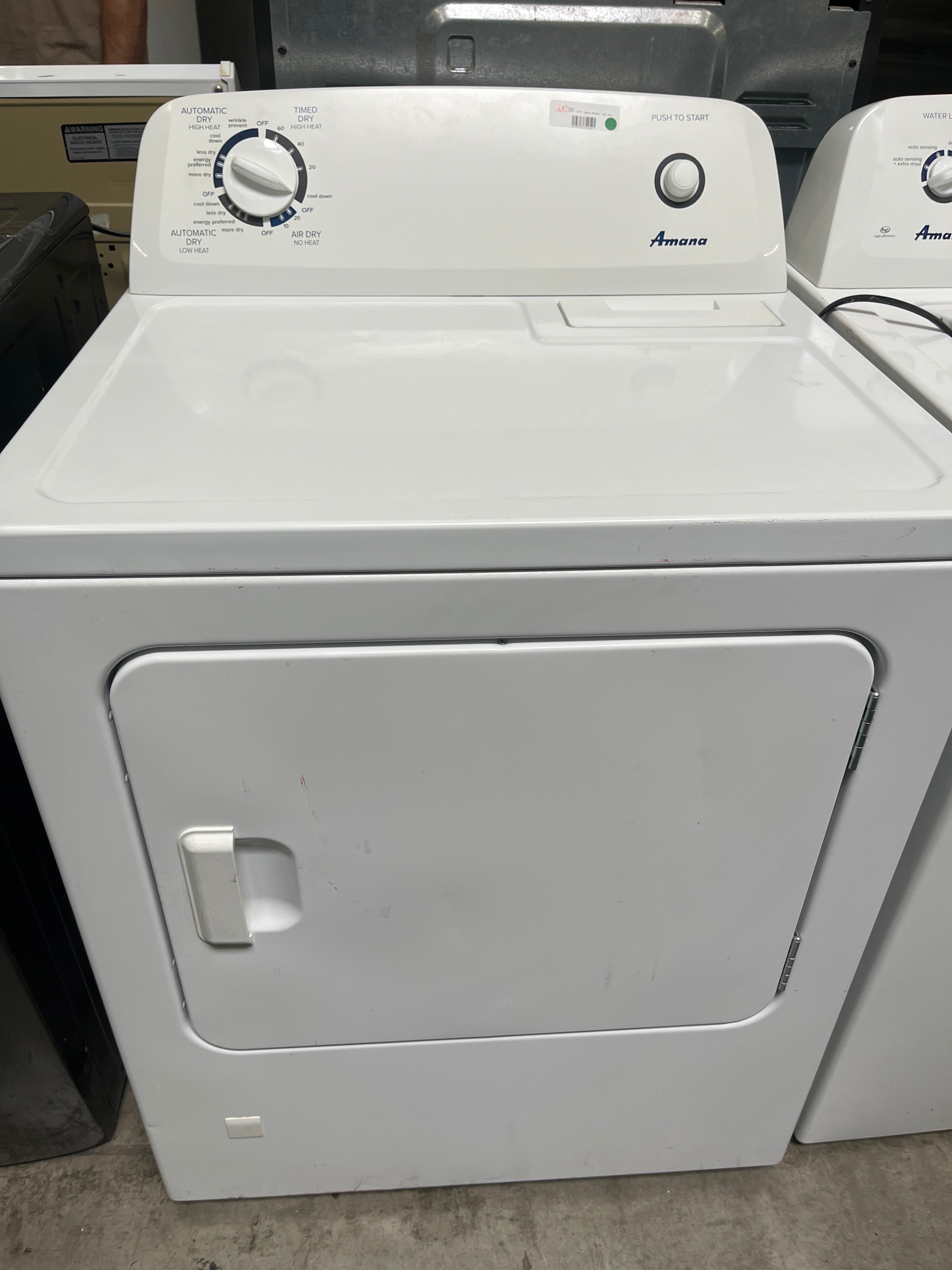 This Amana electric dryer features a classic white finish with a durable metal exterior. It offers easy-to-use settings for your everyday laundry needs. Approximate Size: 3.5 x 2.5 x 2.5