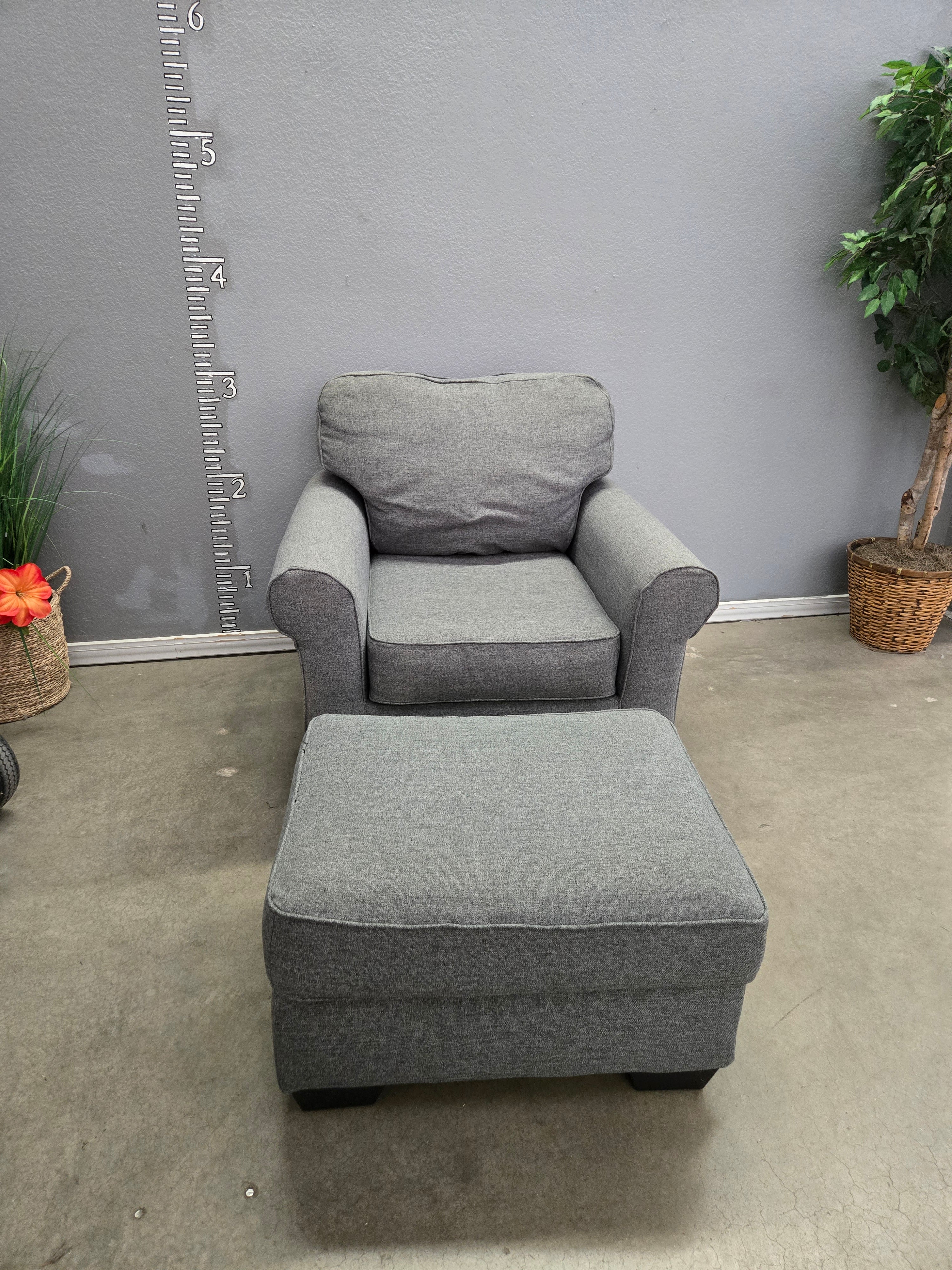 This comfortable armchair and ottoman set features a soft gray fabric with a smooth finish. Its stylish design complements any living room decor. Approximate Size: 3 x 3 x 3