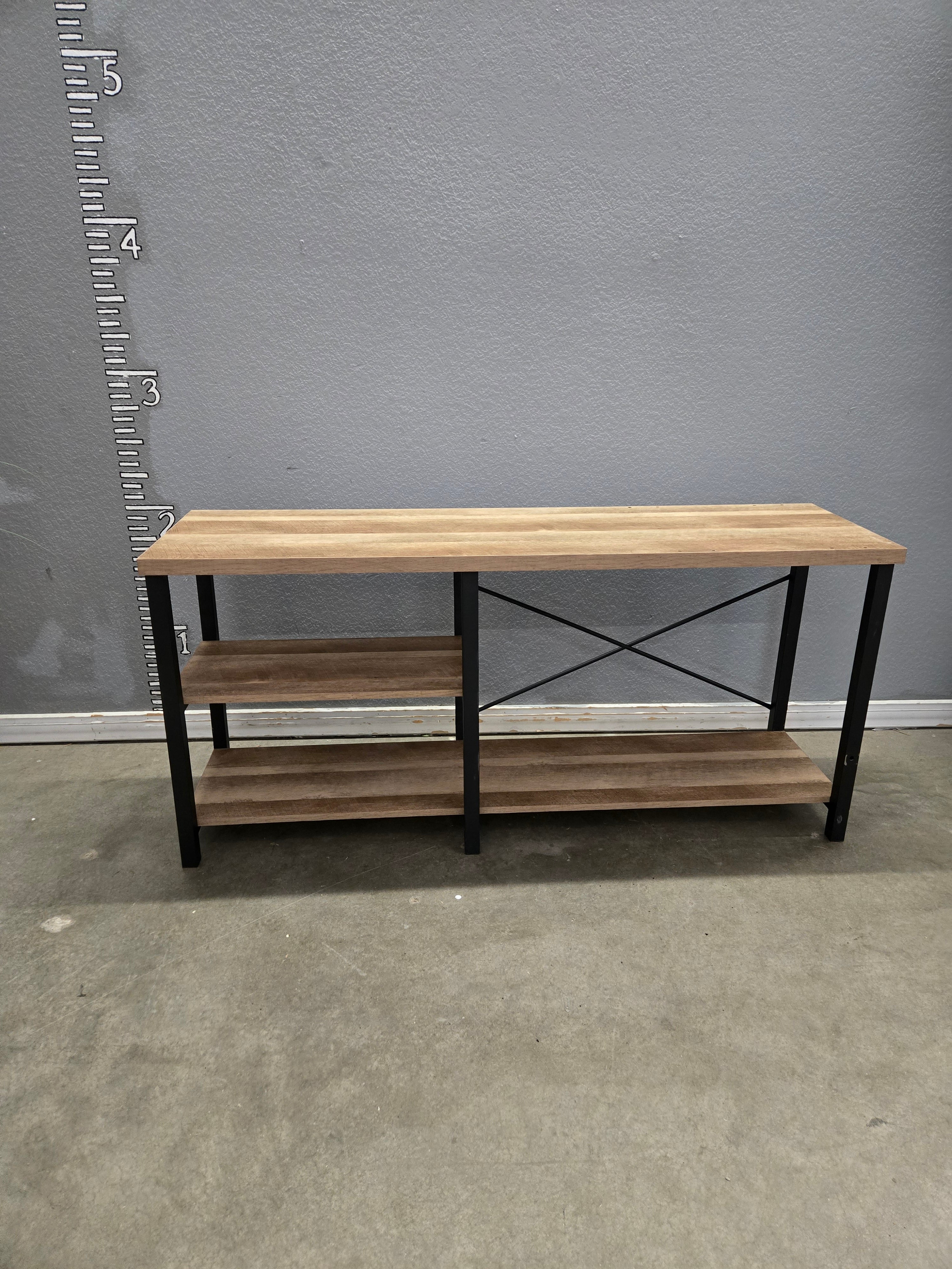 This console table features an industrial design with a natural wood finish and black metal frame. Its open shelving provides ample space for storage and display. Approximate Size: 3 x 5 x 1.5