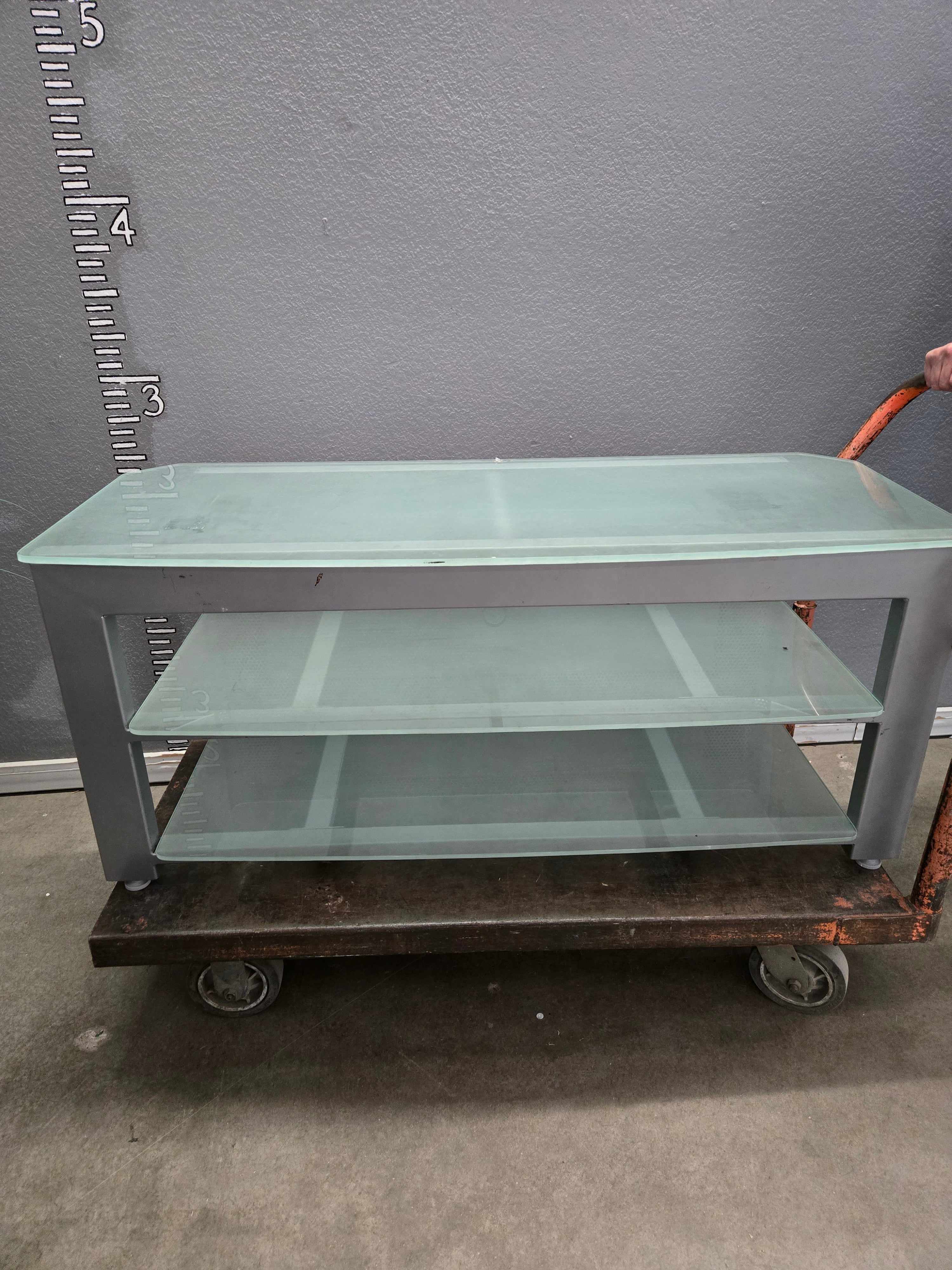 This sleek TV stand features a modern design with a tempered glass top and two glass shelves, complemented by a sturdy metal frame in a silver finish. Perfect for adding a touch of elegance to your living room. Approximate Size: 1.5 x 3 x 1.5