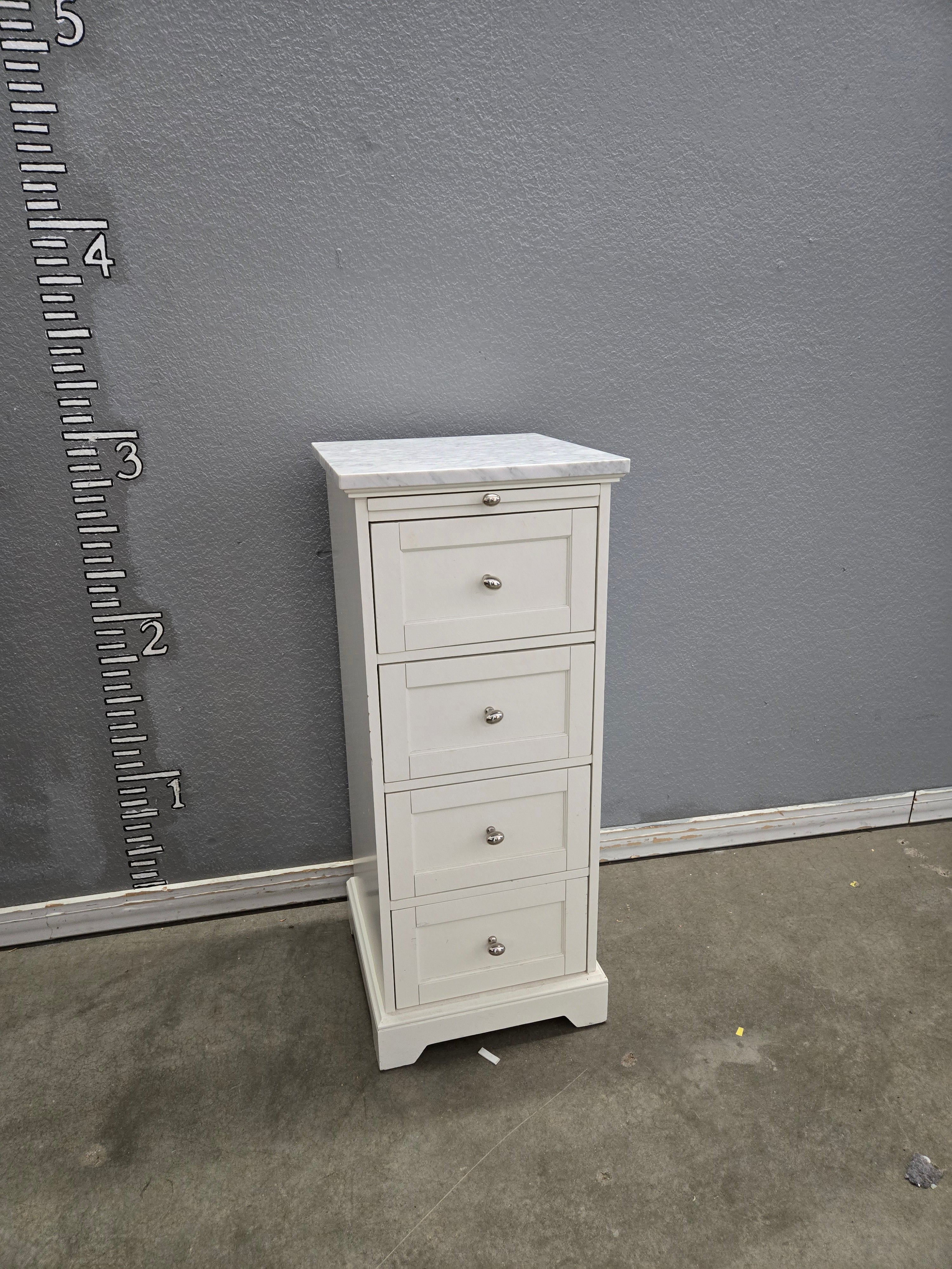 Elegant white wooden cabinet featuring a sleek marble top. The cabinet has a satin finish, providing a smooth and stylish appearance. It is equipped with five drawers for ample storage, making it ideal for organizing household items. Approximate Size: 4.5 x 1.2 x 1