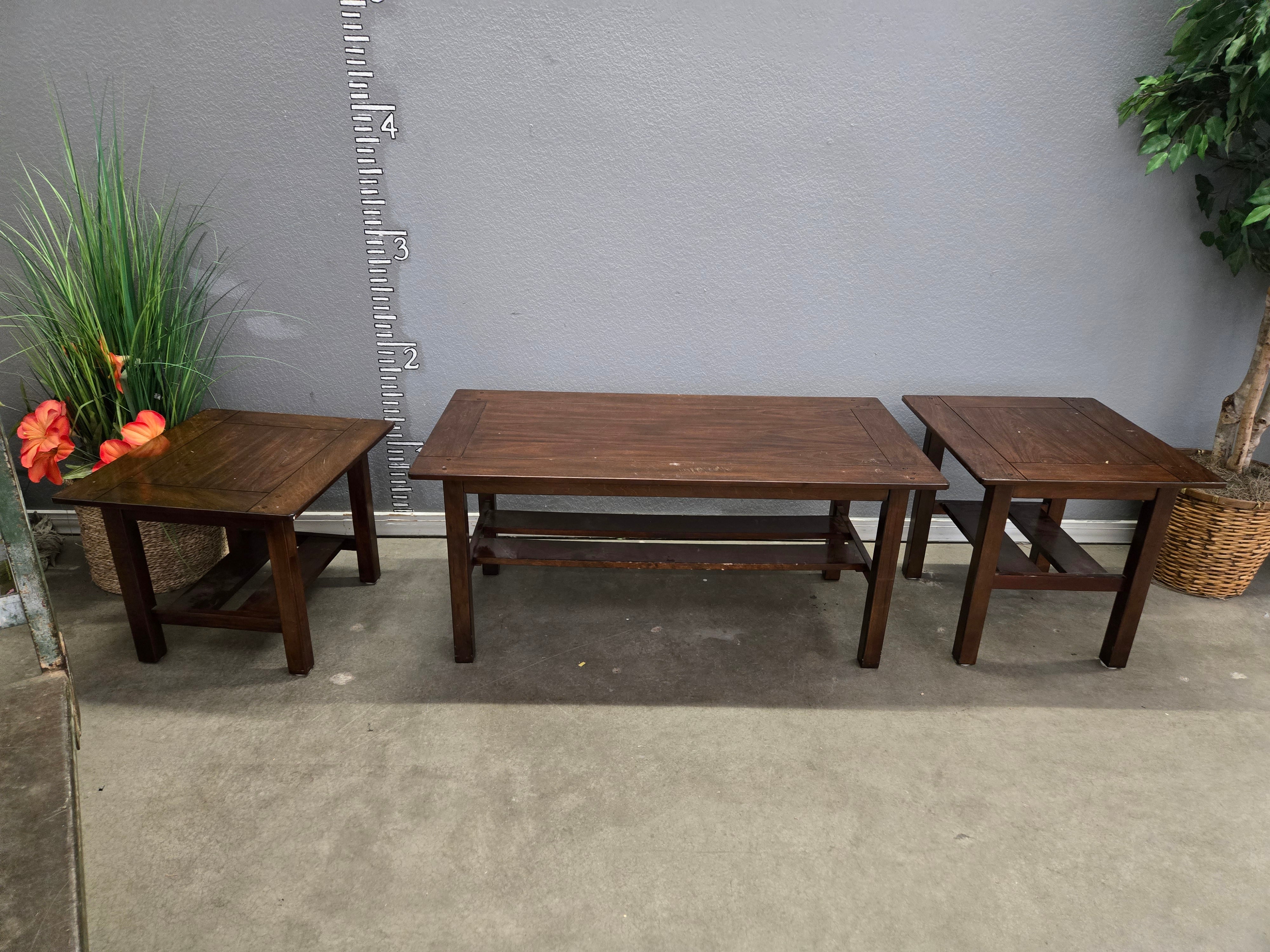 This set includes a dark brown wooden coffee table and two matching end tables. The tables feature a rich, smooth finish that accentuates the natural wood grain, providing a vintage yet timeless appeal. Approximate Size: 1.5 x 4 x 2