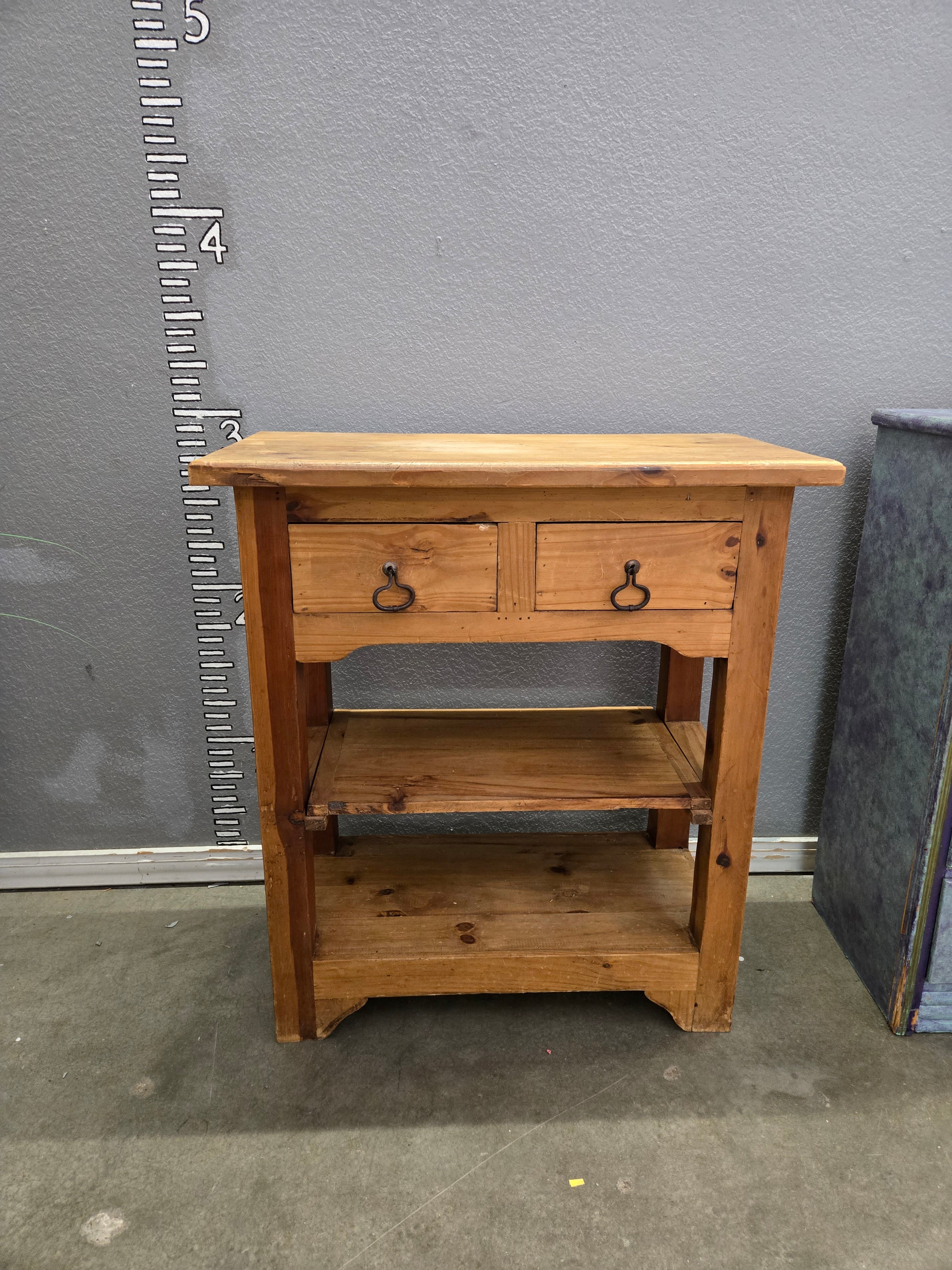 This charming side table features a natural wood finish with two drawers and open shelving. Its rustic design adds a cozy touch to any room. Approximate Size: 3 x 2.5 x 1.5