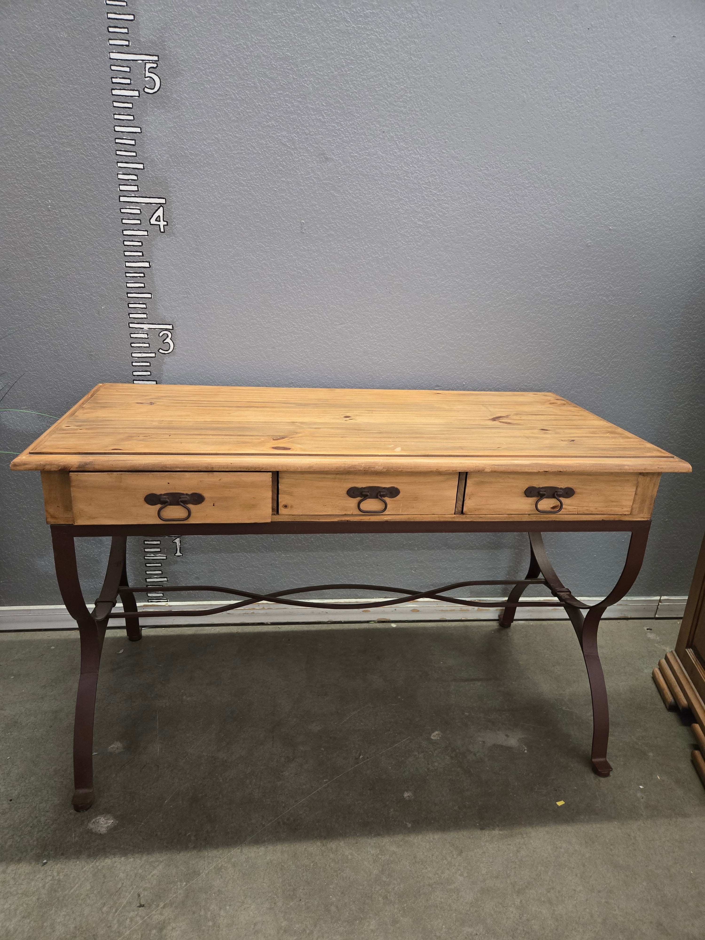 This charming console table features a solid wood top with a natural finish, complemented by sturdy metal legs with an industrial look. The table includes three spacious drawers for storing small items, making it both functional and stylish. Approximate Size: 3 x 4 x 1.5