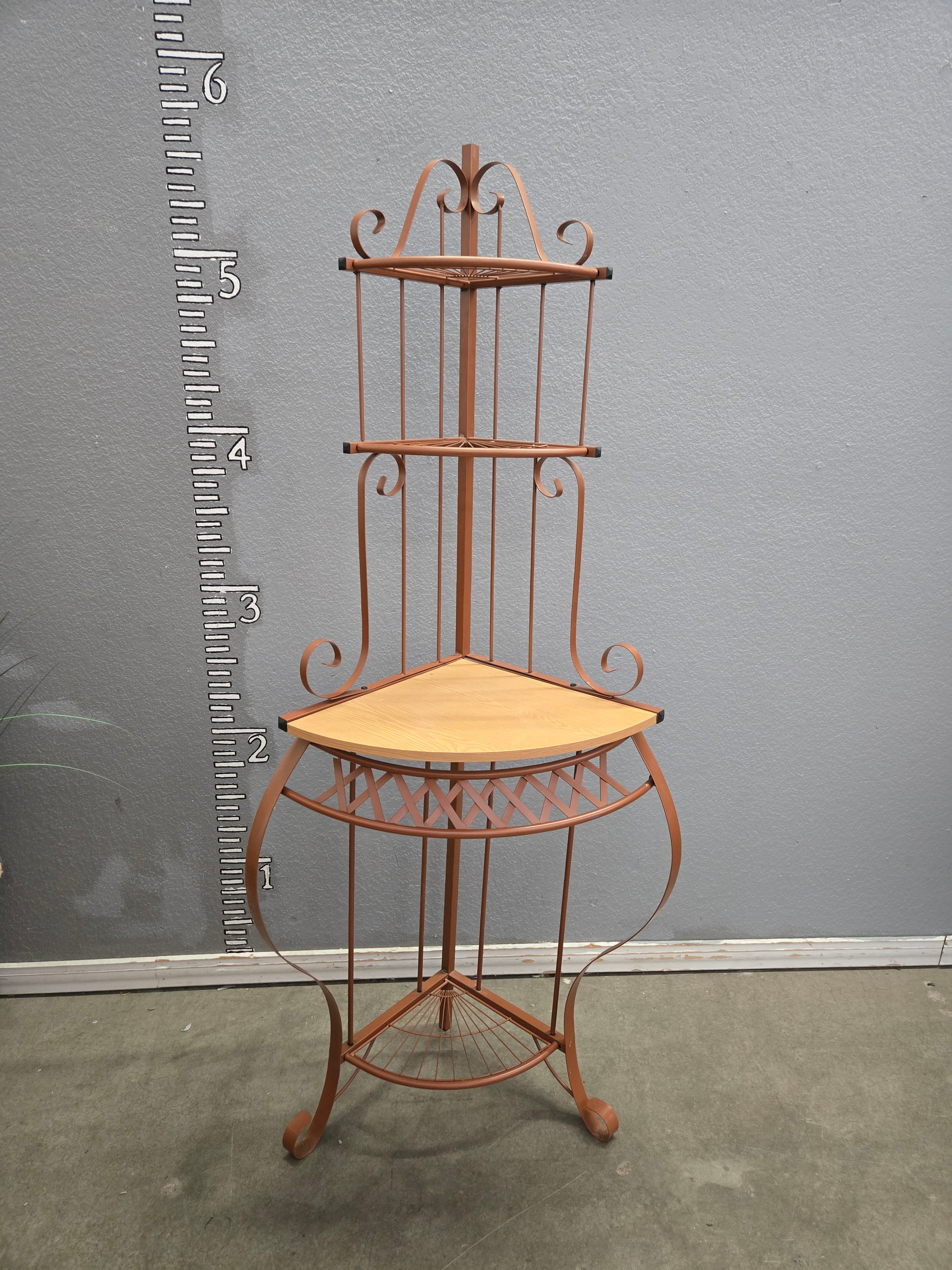 A charming corner shelf featuring a rustic brown metal frame with intricate scrollwork and an elegant wood-look finish on the platform. Perfect for displaying plants or decorative items. Approximate Size: 5 x 2 x 1.5