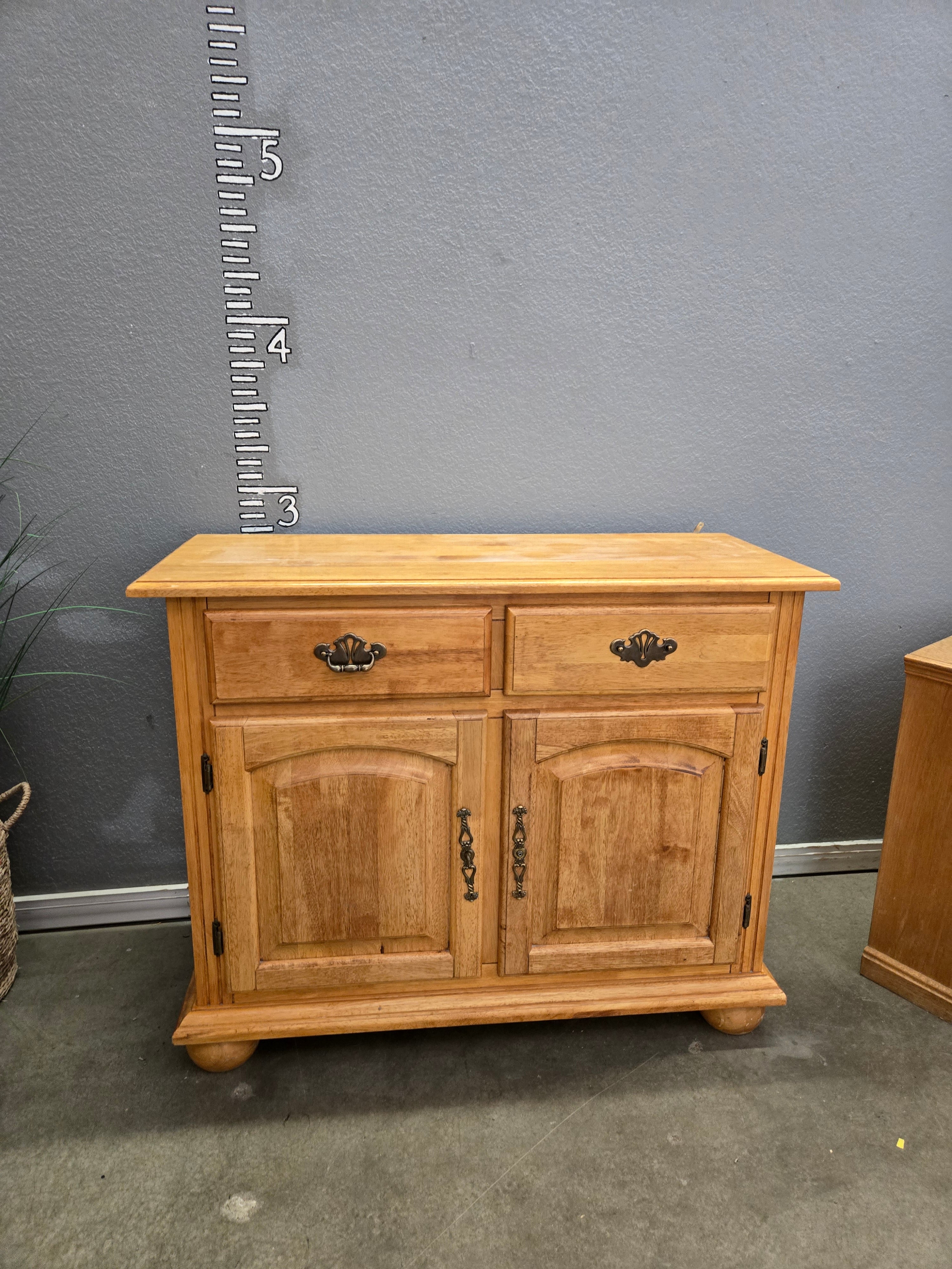 This charming cabinet features a warm oak finish and sturdy wooden construction. It includes two drawers and two decorative doors with intricate metal handles, perfect for adding character to any space. Approximate Size: 3.5 x 3 x 1.5