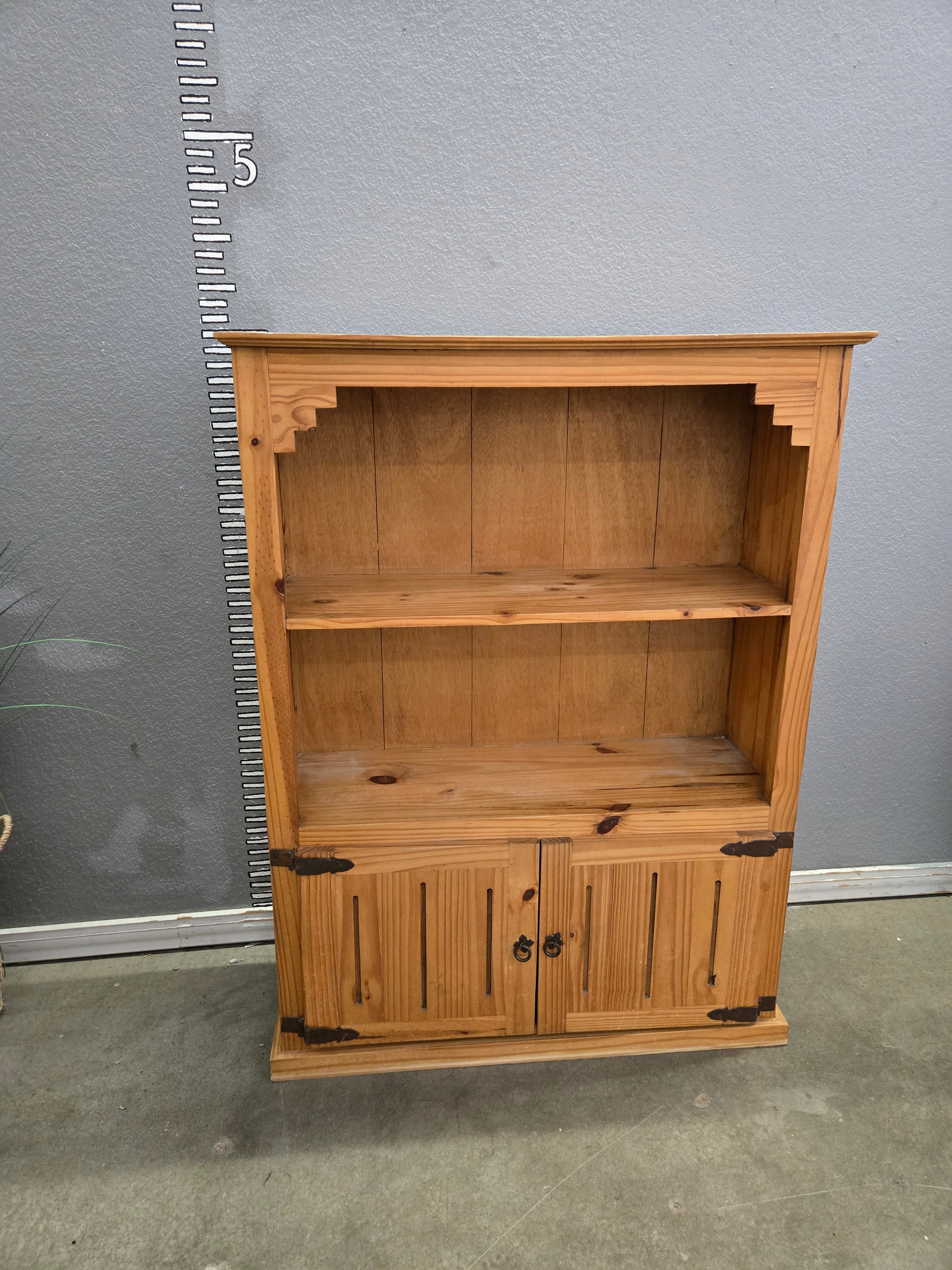 This charming rustic bookshelf is crafted from a natural wood with a warm brown finish, offering a raw and authentic appeal. It features two open shelves and a cabinet with two doors for additional storage. Approximate Size: 4.5 x 3 x 1