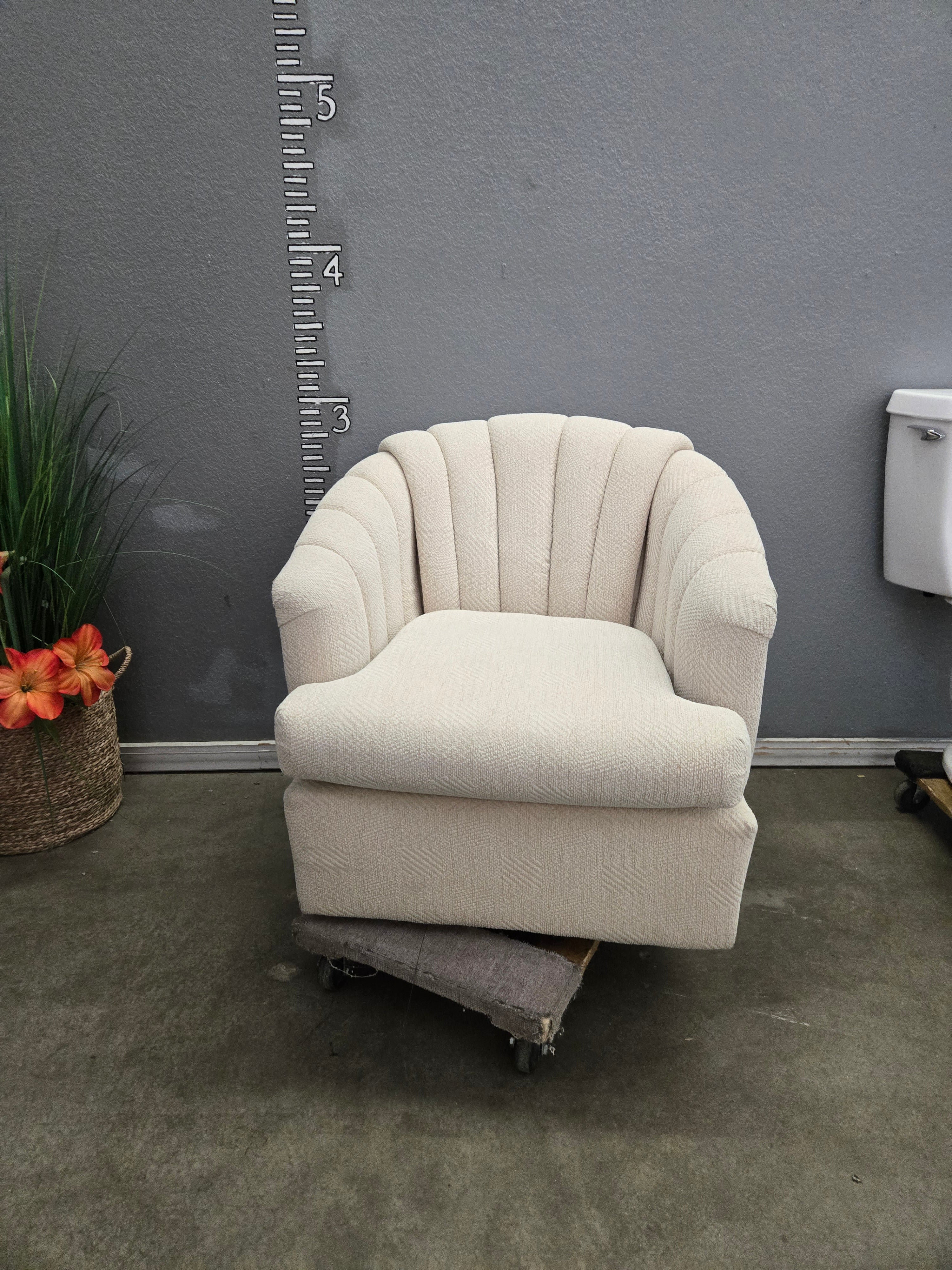 This vintage armchair features a plush, comfortable design with a soft beige fabric and a smooth finish. Perfect for enhancing the cozy ambiance of any living room. Approximate Size: 2.5 x 2.5 x 2