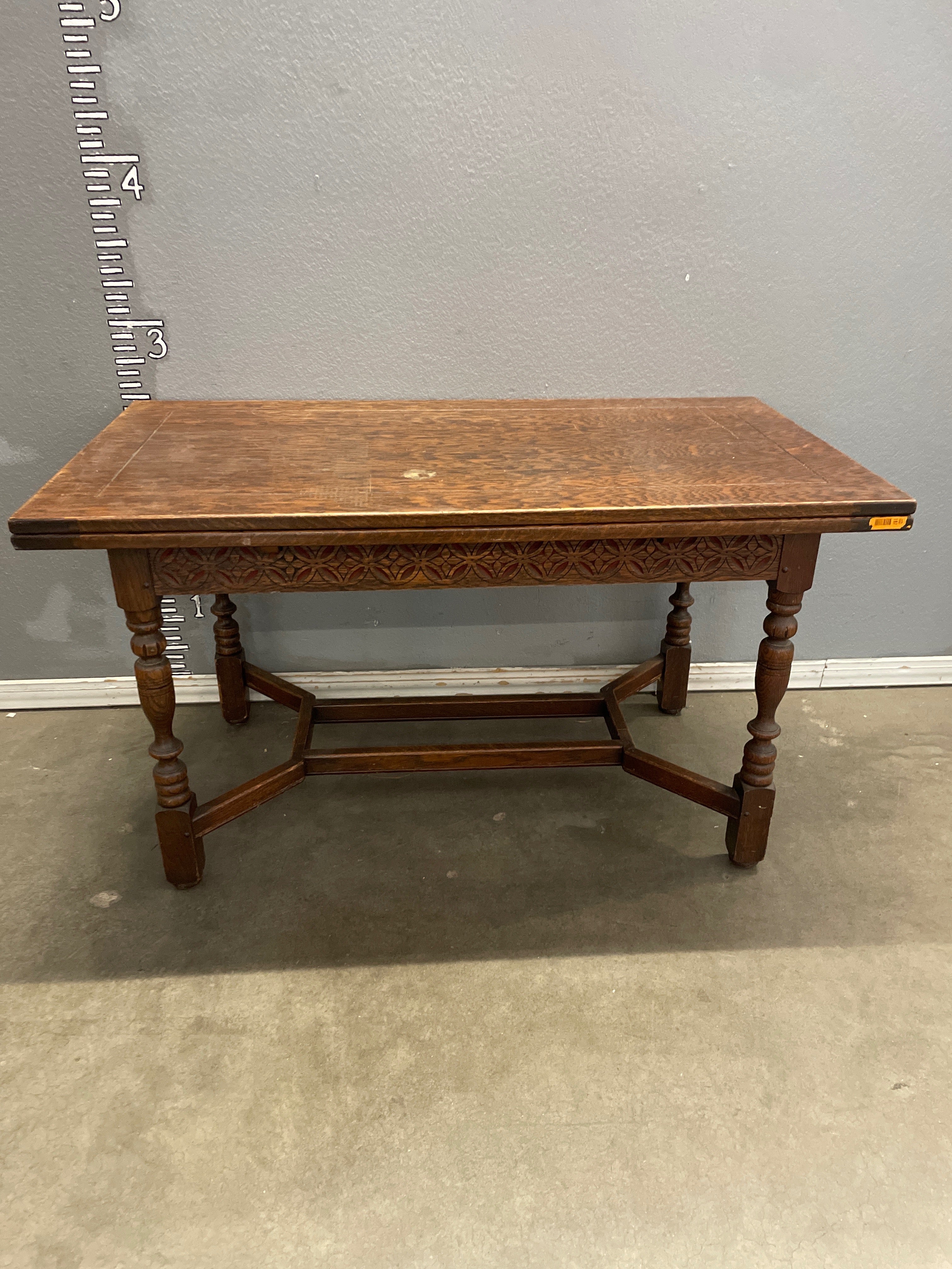 A charming vintage table crafted from solid wood with an intricate carved design around the edges. The table features a rich brown color with a polished finish. Approximate Size: 3 x 4 x 2